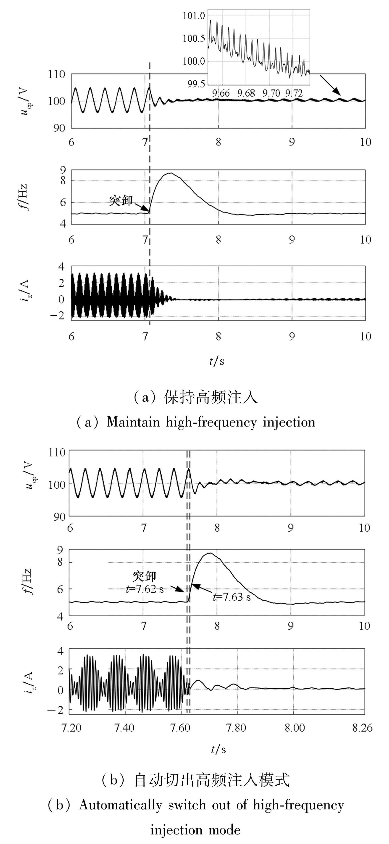 为验证高频注入模式切换策略的性能,在f=5 Hz工况下开展负载转矩阶跃实验(空载→0.3p.u.→空载),图11~12对比了固定模式与自动切换策略的控制效果。为便于观察,对切入和切出高频注入模式(图11(b)图12(b))中iz波形的横坐标进行了放大。实验数据显示:当突加0.3p.u.负载时,固定无注入模式电容电压剧烈波动(88~115 V,峰峰值27 V)并引发电机频率振荡(图11(a)),而自动切换策略在负载突变0.02 s后即激活高频注入,将电容电压稳定在95.1~105.2 V(脉动系数5.05%),且在电机频率恢复的过程中未出现明显振荡;从图12(a)图12(b)对比可以看出,保持高频注入模式在负载突卸后仍注入了高频共模电压和高频环流,这使得电容电压存在高频脉动分量(幅值为额定电压的0.71%);而自动切换策略在突卸负载0.01 s后即切出高频注入模式,避免继续注入不必要的高频环流和高频共模电压,既降低了控制复杂度,也消除了电容电压高频脉动。