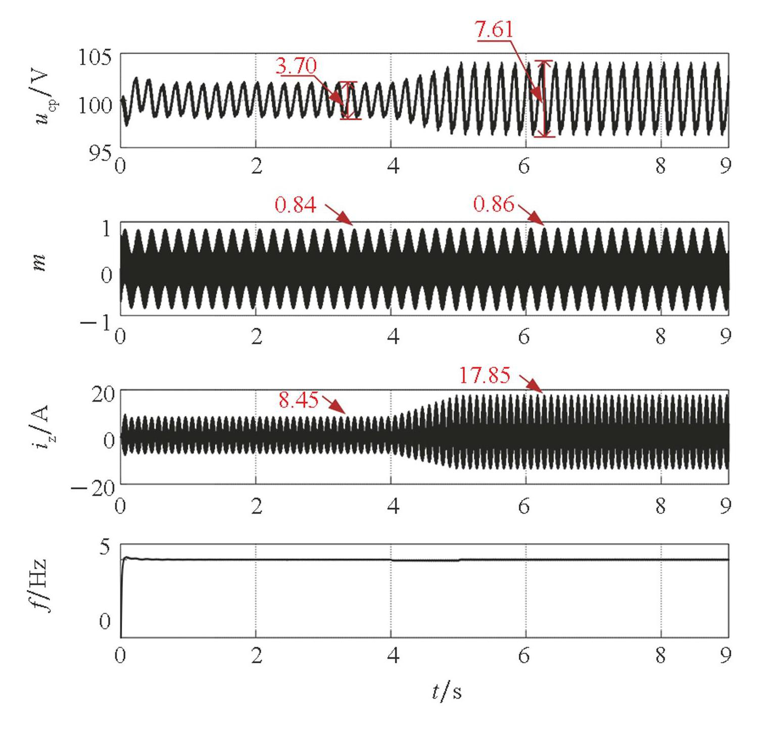 4)在动态过程中采用稳态模型求得的参数表虽可实现控制目标,但受电机加速度、转动惯量变化及电磁-机械能量耦合的影响,会出现瞬态电容电压脉动和调制波幅值略微超限的现象。虽然超调持续时间较短,但在高精度应用中仍需改进。需要特别注意的是,由于在线修正kkm需要实时检测电容电压脉动系数和输出调制波幅值,而检测周期与运行频率成反比,因此在极低频运行时,动态响应性能将受较大影响。这一问题在负载快速变化的情况下尤为明显,未来需研究基于预测的延迟补偿算法来改善低频动态性能。
