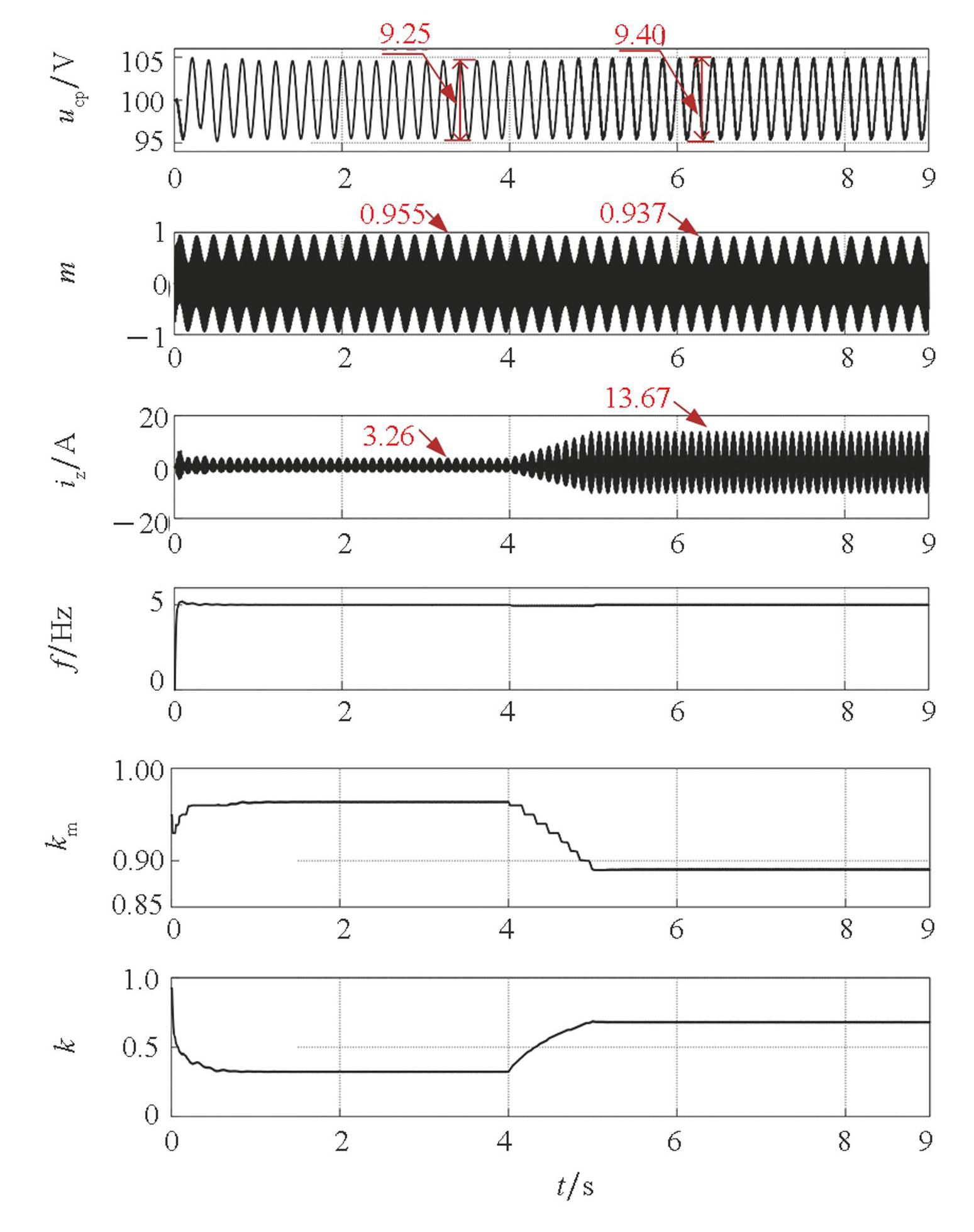 为对比传统固定参数的高频注入法和参数查表优化的高频注入法在控制性能上的差异,以下述动态过程为例展开实验验证。该系统首先启动并稳定运行在f=5 Hz,TL=0.3p.u.工况,在实验进行到t=4 s时刻,TL在1 s内逐渐升高到0.6p.u.。实验分别采用固定参数(k=0.8,km=0.8)和参数查表高频注入法,所得结果如图13图14所示。可以看出,当系统运行在f=5 Hz,TL=0.3p.u.工况时,固定参数高频注入法电容电压的脉动系数为1.85%,调制波幅值为0.84,环流幅值为8.45 A,而参数查表高频注入法脉动系数为4.63%,调制波幅值为0.955,环流幅值为3.26 A。相比之下,后者在电压脉动和调制波允许的范围内,使环流幅值下降了61.4%。随着TL的升高,采用参数查表高频注入法的kmk能够随之调整,使得电容电压脉动系数、调制波幅值、环流幅值最终稳定在4.75%、0.937和13.67 A,与固定参数高频注入法相比,环流幅值降低了23.4%。值得注意的是,与理论计算结果相比,实验结果中电容电压脉动系数和调制波幅值与设定的限制值(分别为5%和0.95)存在一定的偏差。这种偏差可能源于多种非理想因素,包括但不限于模型参数误差、线路中的杂散电阻和杂散电感、三相负载的不对称性、脉冲死区效应以及控制器的延时等。