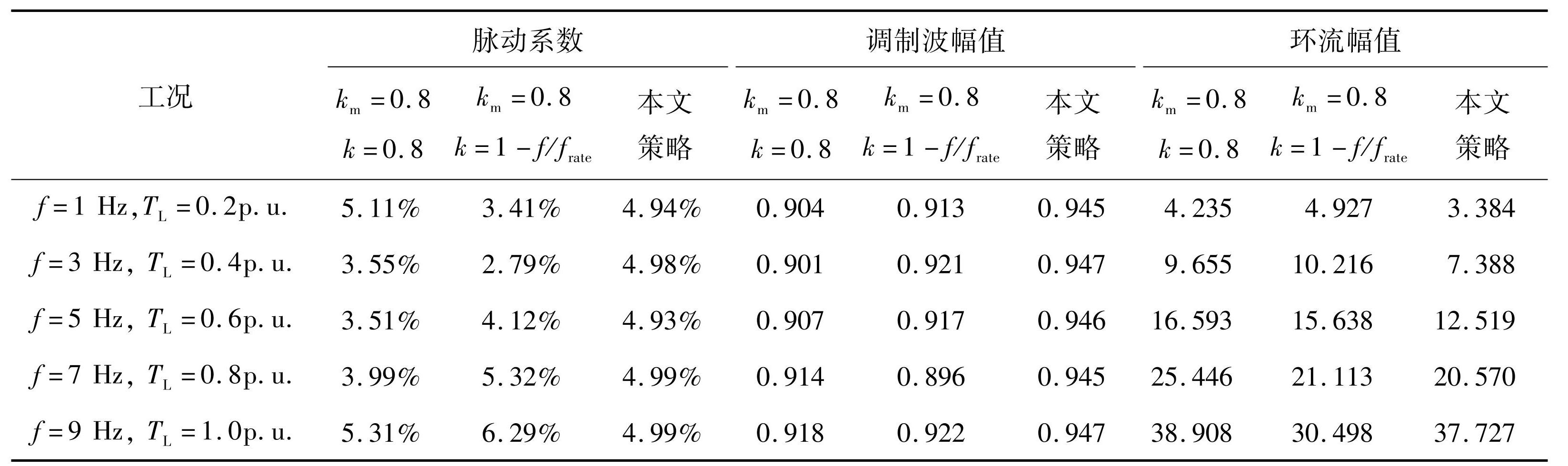 进一步对比不同频率和负载条件下,采用固定参数(km=0.8,k=0.8)以及文献[19-21]所述方法(文献[19-21]思路类似,均为随工况变化调整k,从而降低注入环流幅值,因此文中以文献[21]为例进行对比,即km=0.8,k=1-f/fratefrate为额定功率)与本文所提方法的运行特性,结果如表5所示。数据表明,采用固定参数和文献[21]所提策略在不同的工况下,均存在“过调控”或“欠调控”的问题。如固定参数法在f=1 Hz、TL=0.2p.u.和f=9 Hz、TL=1p.u.的工况下,电压脉动超限,文献[21]所提方法在f=7 Hz、TL=0.8p.u.和f=9 Hz、TL=1p.u.的工况下,电压脉动超限,且两种策略在所有表中实验工况下,调制波幅值均未逼近限制值。而采用本文策略时,对于各种工况,均可保证脉动系数和调制波幅值尽可能逼近限制值,从而使得系统在满足约束条件的情况下,尽可能降低环流幅值。