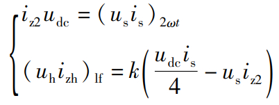 上、下桥臂的瞬时功率如式(2)所示。由式(2)可知,如果控制二倍频环流抵消二倍频功率脉动,则第②项为零;注入高频电压电流乘积产生的低频分量抵消第③项中的低频分量,那么瞬时功率脉动的低频分量便转移为高频分量,从而使电压脉动得到了降低。因此,注入电压和电流应满足式(3),其中,k表示抵消比例系数,下标2ωt和lf分别表示二倍频和低频(基波和3次谐波)的分量。