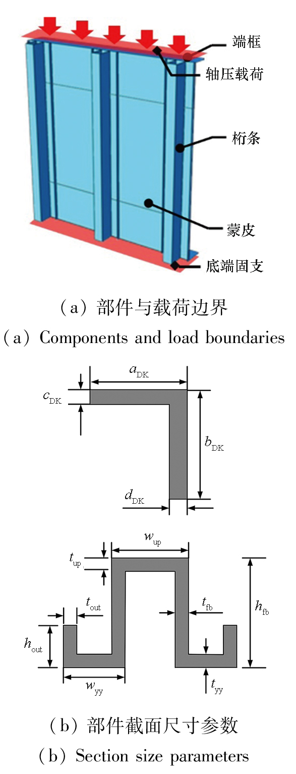 本文研究的加筋壁板结构采用同侧“几”形桁条均布加筋,另一侧“L”形上下端框固定,整体结构高度与宽度均为600 mm,具体结构、载荷工况以及端框与桁条的横截面几何参数如图1所示。其中,aDK、bDK、cDK与dDK为端框截面的宽度与厚度,tup、tout、tfb和tyy为桁条中腹板及翼缘板等截面厚度,wup、wyy、hfb和hout为桁条中腹板及翼缘板等截面的宽度与高度。