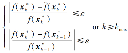 其中,(x*k)与f(x*k)分别为第k次迭代时近似最优解x*k对应的近似模型预测响应与有限元计算真实响应,ε为极小值,kmax为最大迭代次数。