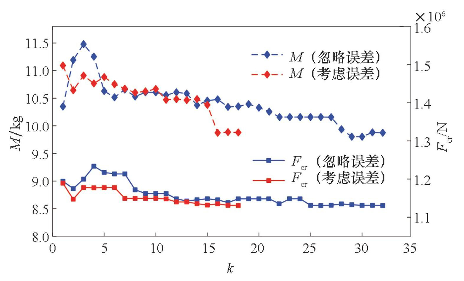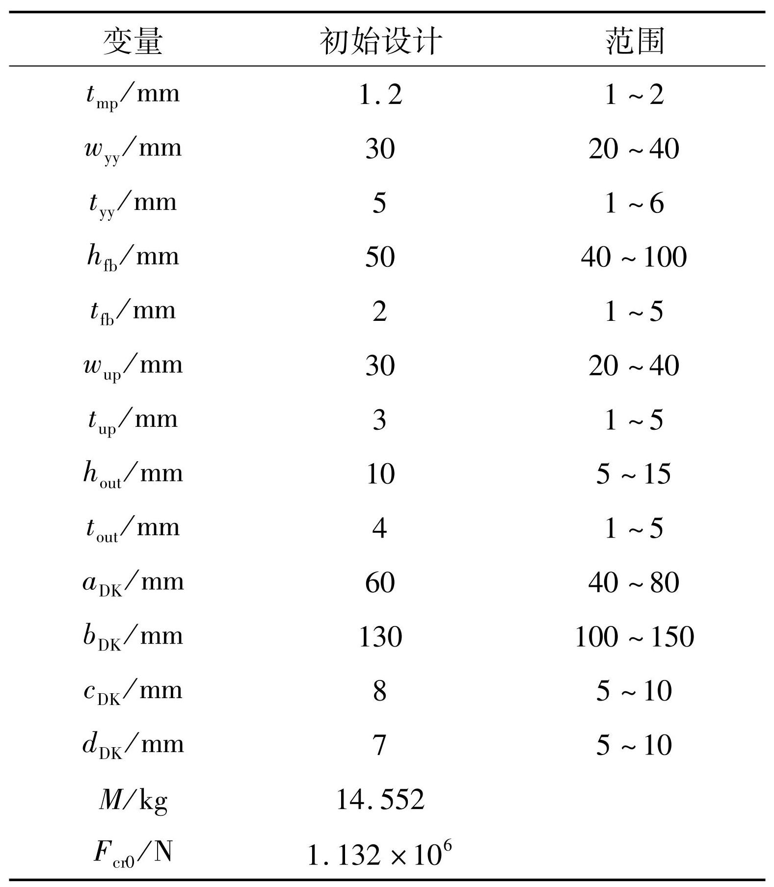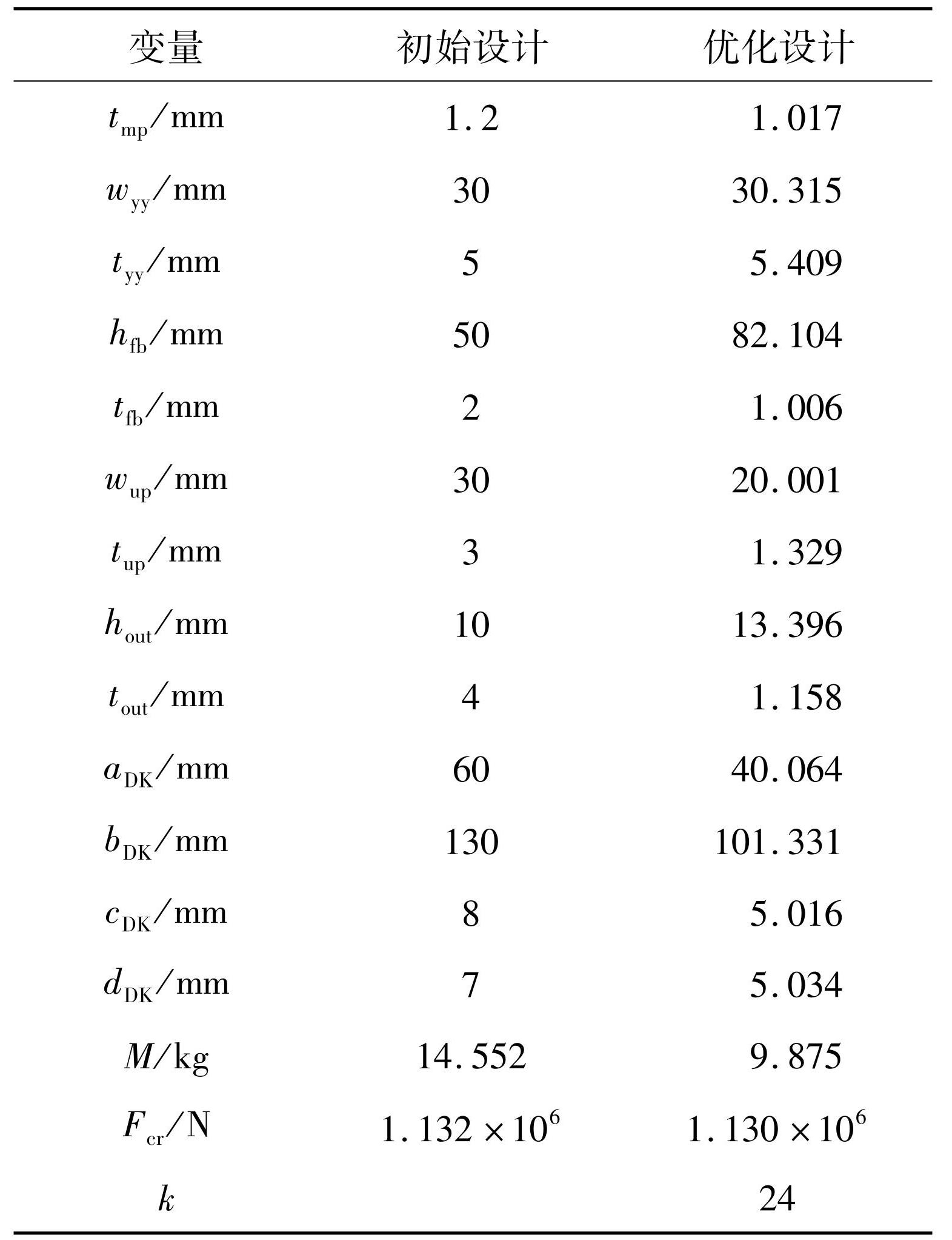 注:tmp为蒙皮厚度,M、Fcr0分别表示初始设计结构质量和极限载荷。