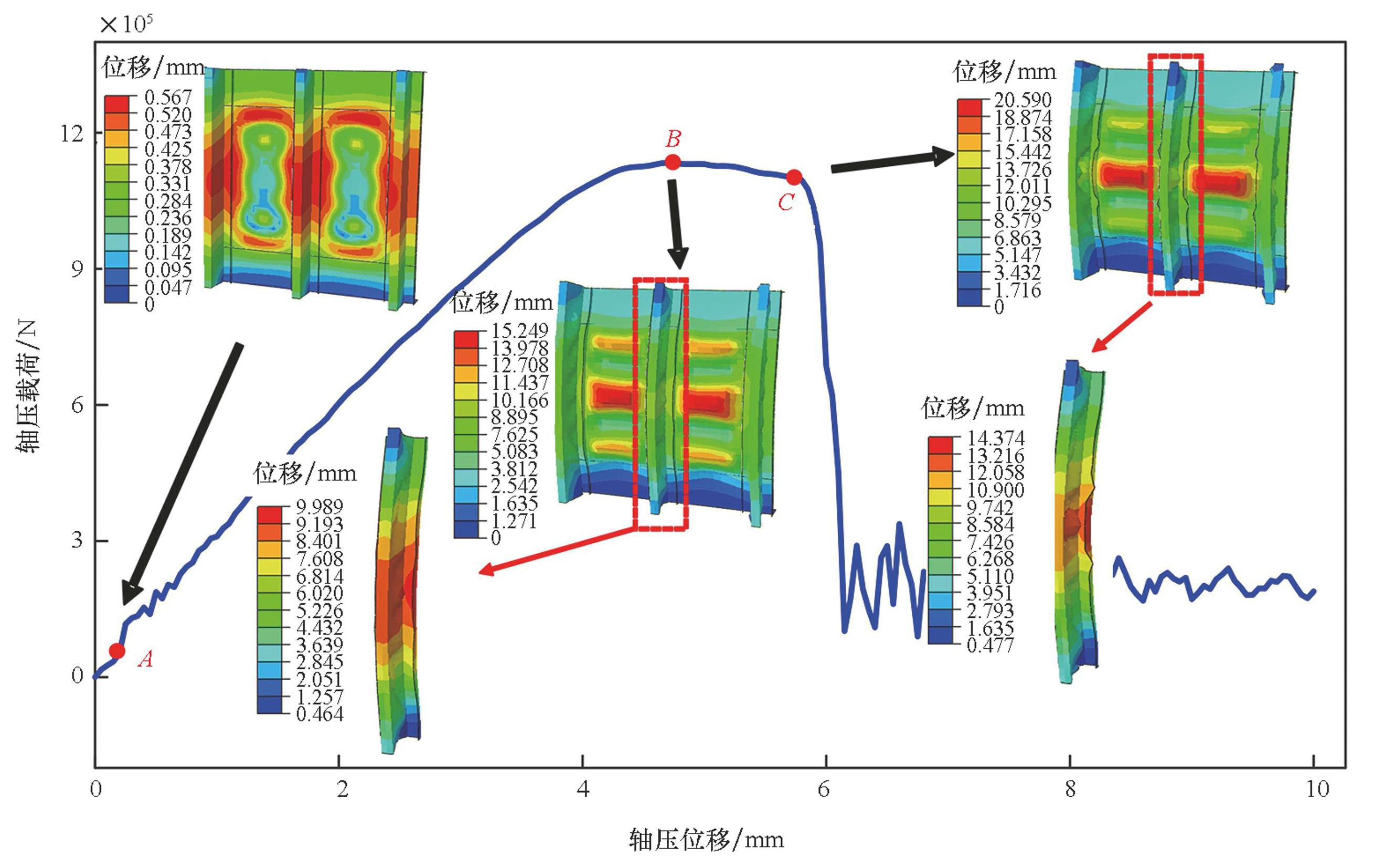 图2所示为加筋壁板轴压失效过程及其加载位移-载荷曲线。易可知,随着轴压载荷加载,结构先后进入线性前屈曲阶段、非线性后屈曲阶段及压溃失效阶段。在加载伊始(图中A点),框桁格间内蒙皮出现垂直蒙皮方向的局部半失稳波形;随着载荷继续增大,蒙皮失稳波形扩展,形成了5个对称分布的半失稳波形,此时结构进入非线性后屈曲状态(图中B点);继续增加轴压载荷(图中C点),蒙皮上进一步扩大的对称半失稳波带动相邻桁条的缘板甚至腹板出现翘曲变形,但此时桁条仍可以继续承载;随着轴压载荷继续施加,蒙皮的失稳波变大并沿着两侧桁条扩展,进一步加剧桁条发生弯扭耦合翘曲失稳,当桁条翘曲变形到一定程度时,加筋壁板随即丧失轴压承载能力,进入压溃失效阶段(图中D点)。
