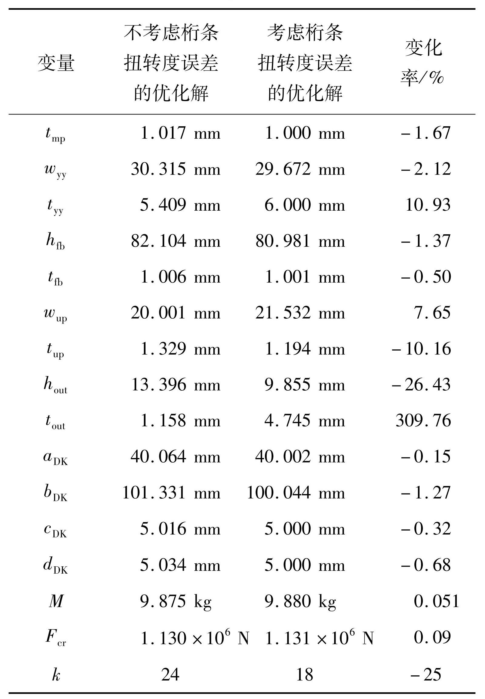 注:变化率=(考虑桁条扭转度误差的优化解-不考虑桁条扭转度误差的优化解)/不考虑桁条扭转度误差的优化解×100%。