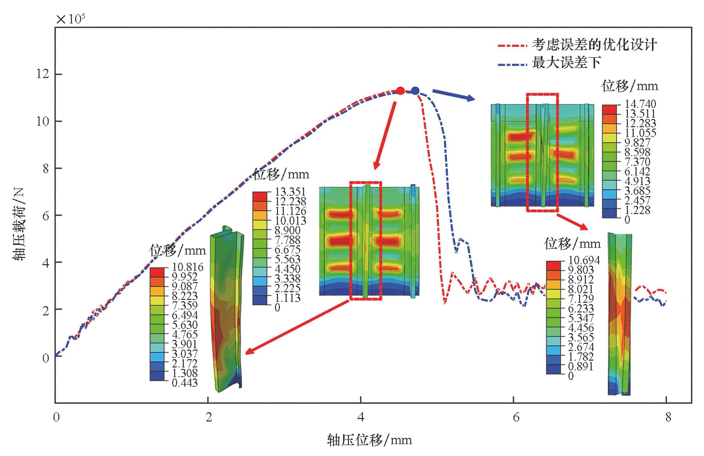 表4为考虑/未考虑桁条扭转度误差的加筋板最优解对比,由表可知,考虑误差因素下的经优化结构的“几”形桁条翼缘板与外侧腹板厚度增大,其余设计变量的取值均不同程度的减小,结构的承载性能与鲁棒性得到提升,这一结果也验证了1.2节中提出的减小桁条翼缘板宽厚比(即增大翼缘板厚度)有助于提升承载性能、降低误差敏感性的相关分析结论。图9为考虑误差的加筋壁板优化设计结构及其在最大误差下得到的轴压-位移曲线与极限载荷对应的结构位移云图,最大误差下框桁格间蒙皮失稳波形仍不对称,桁条的弯扭耦合翘曲失稳导致结构整体压溃。
