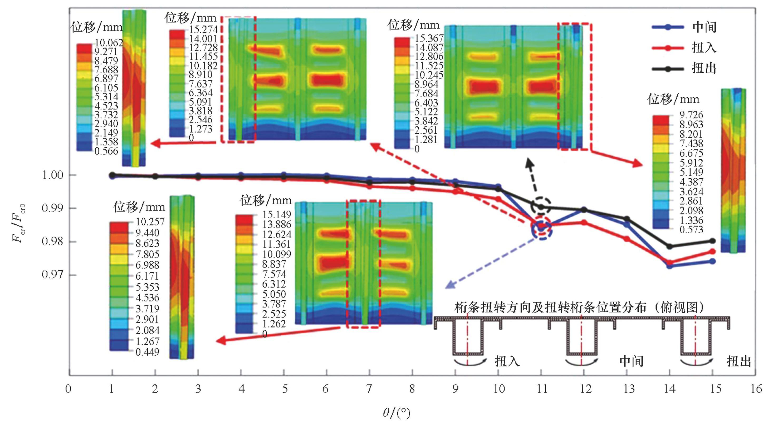 图4结构承载能力随桁条扭转角度变化曲线(不同分布位置)