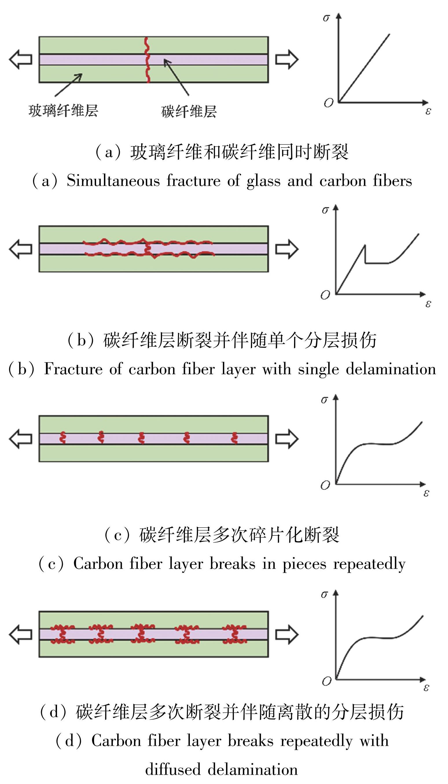 图1纤维混杂复合材料不同失效模式及对应拉伸应力-应变曲线