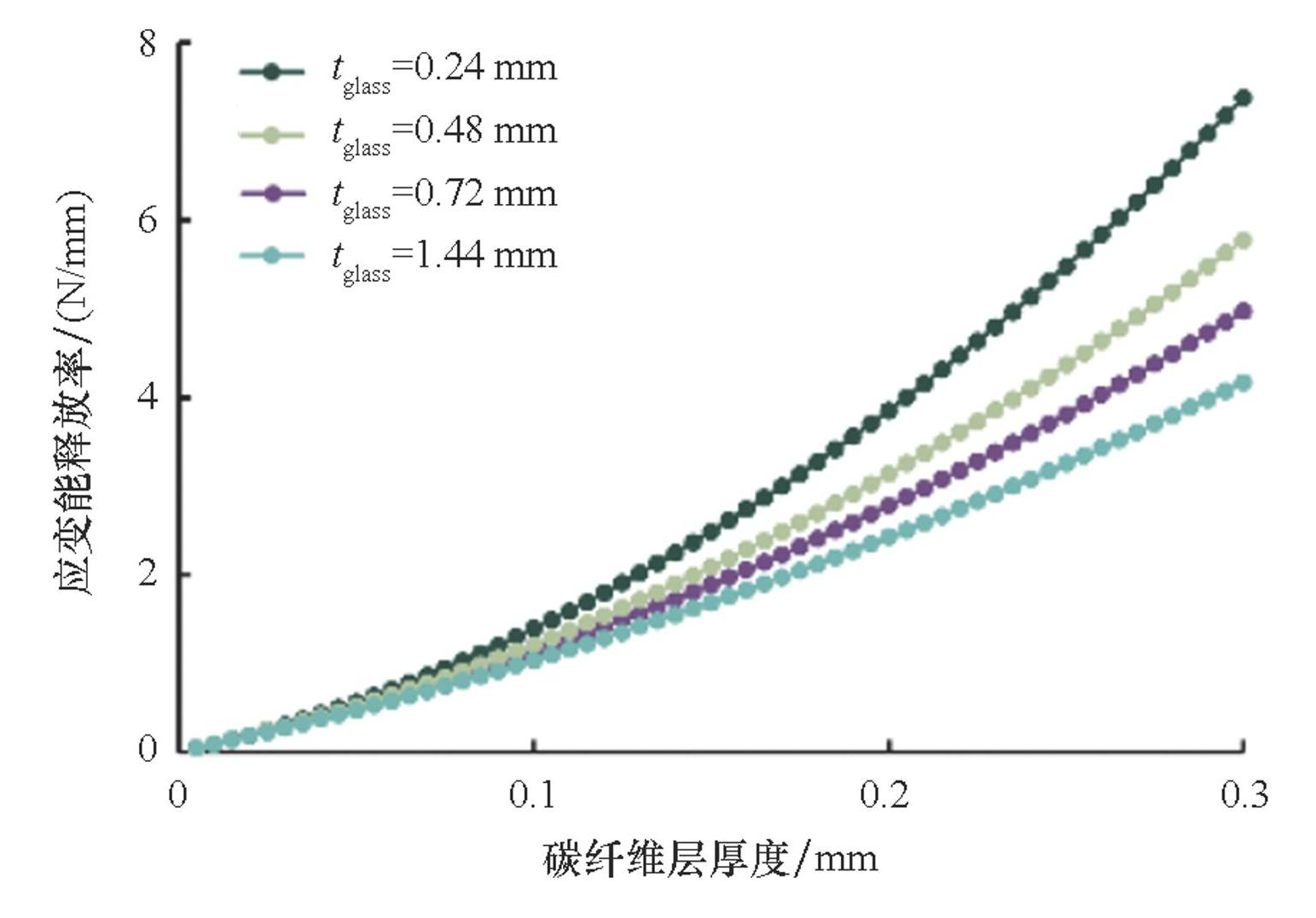 图9不同玻璃纤维层厚度下应变能释放率随碳纤维层厚度变化曲线