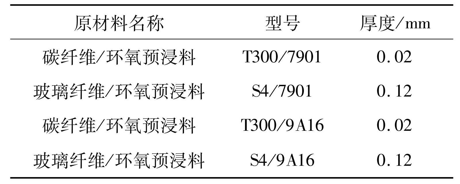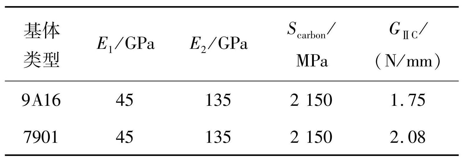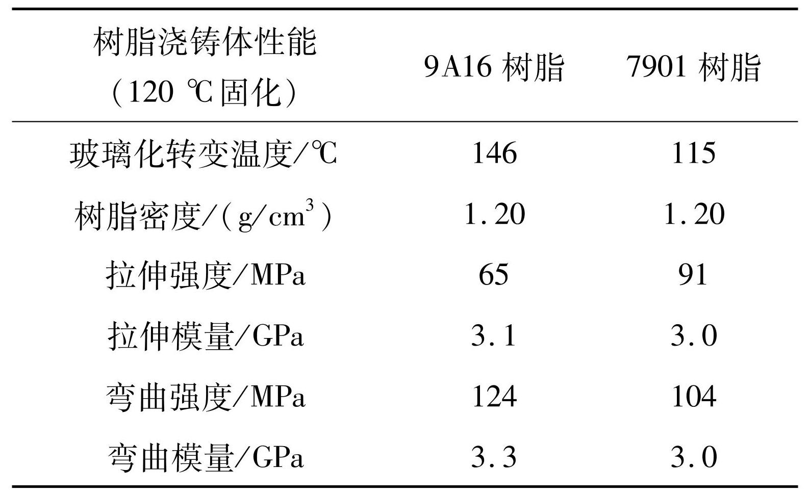实验所用的原材料如表1所示。其中,9A16树脂和7901树脂均为双酚A型环氧树脂,其基本性能见表2。由表2可知,两种牌号的环氧树脂除了玻璃化转变温度(Tg)和拉伸强度存在一定差异,其他性能基本相当。但是二者所使用的增韧剂类型和含量均不相同,故其断裂韧性存在显著差异。由于生产厂商并未对相关性能参数进行表征,表2中无断裂韧性具体数值,因此后续对层间断裂韧性进行了实验表征。