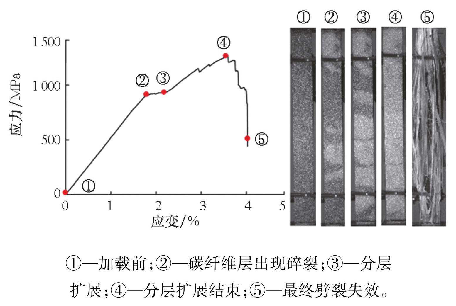 图11C4(9A16)碳/玻混杂复合材料应力-应变曲线及失效过程图