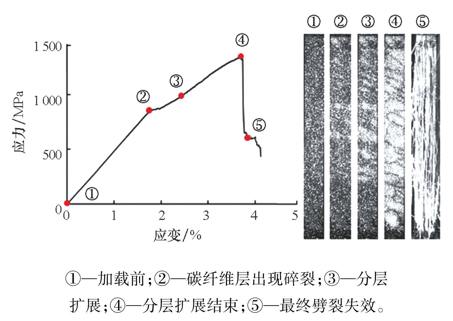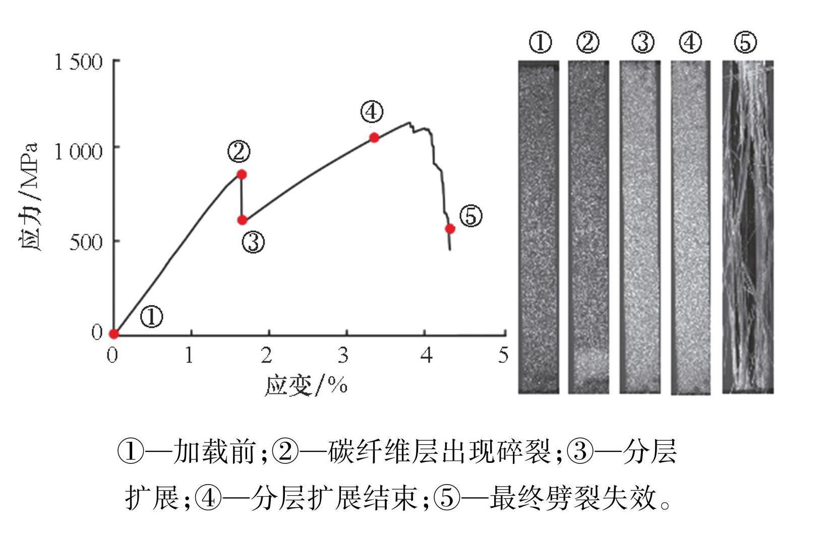 图13C8(9A16)碳/玻混杂复合材料应力-应变曲线及失效过程图