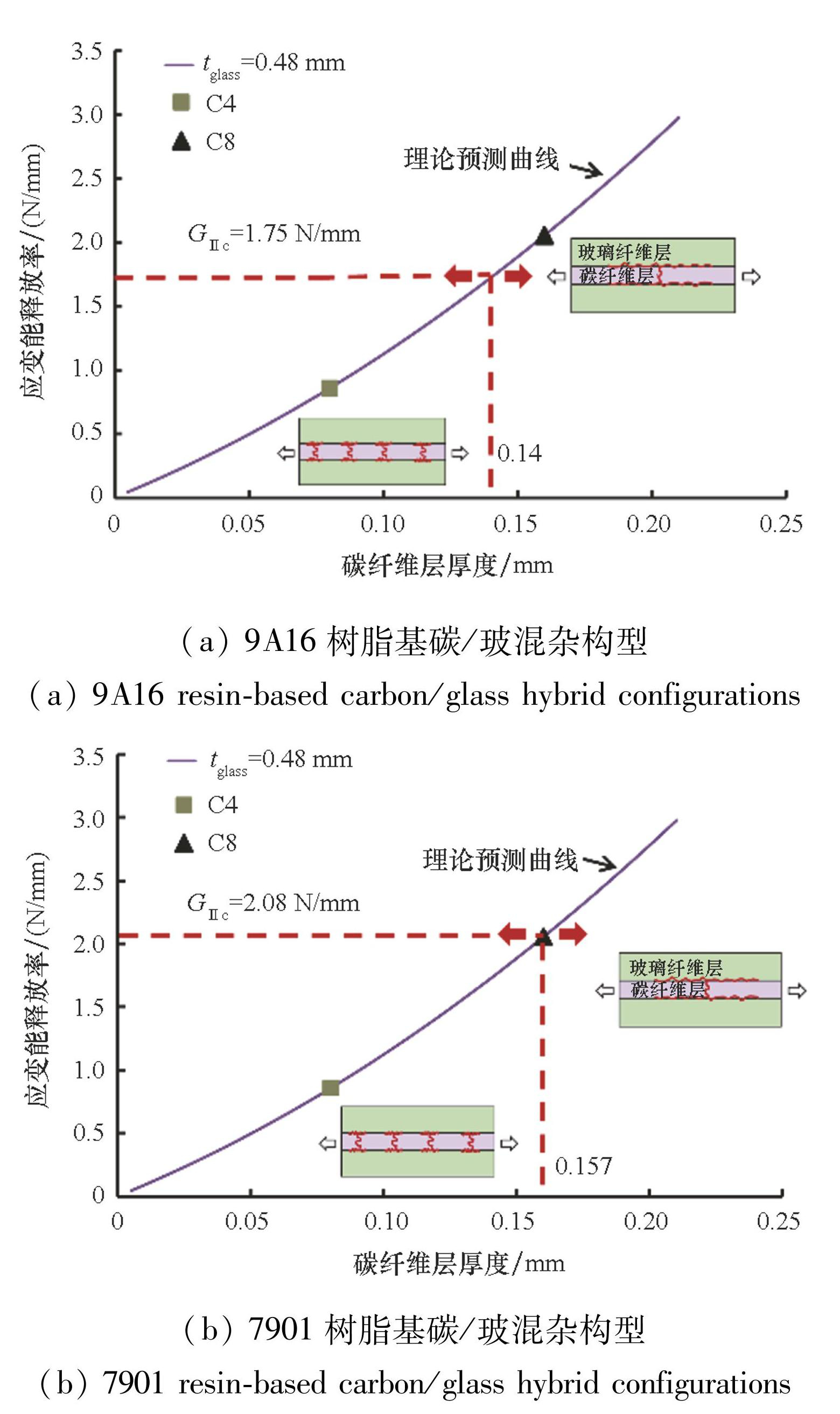 根据3.1节中的测试结果,结合前述理论推导,可以计算得到以9A16树脂为基体的碳/玻混杂复合材料中碳纤维实现碎片化断裂的临界厚度为130 μm,而以7901树脂为基体的混杂复合材料的临界厚度为157μm。由于碳纤维单层厚度为20μm,则分别需要6层和8层碳纤维的堆叠以达到其临界厚度。图15所示为理论预测的碳纤维层临界厚度与实验测量值的对比。由图可知,在特定的GⅡC下,通过理论计算得到的混杂复合材料碳纤维层的临界厚度与实际构型中的碳纤维层厚度的比较,可以预测碳/玻混杂复合材料的失效模式,经对比,理论预测与实验测量结果具有良好的一致性。