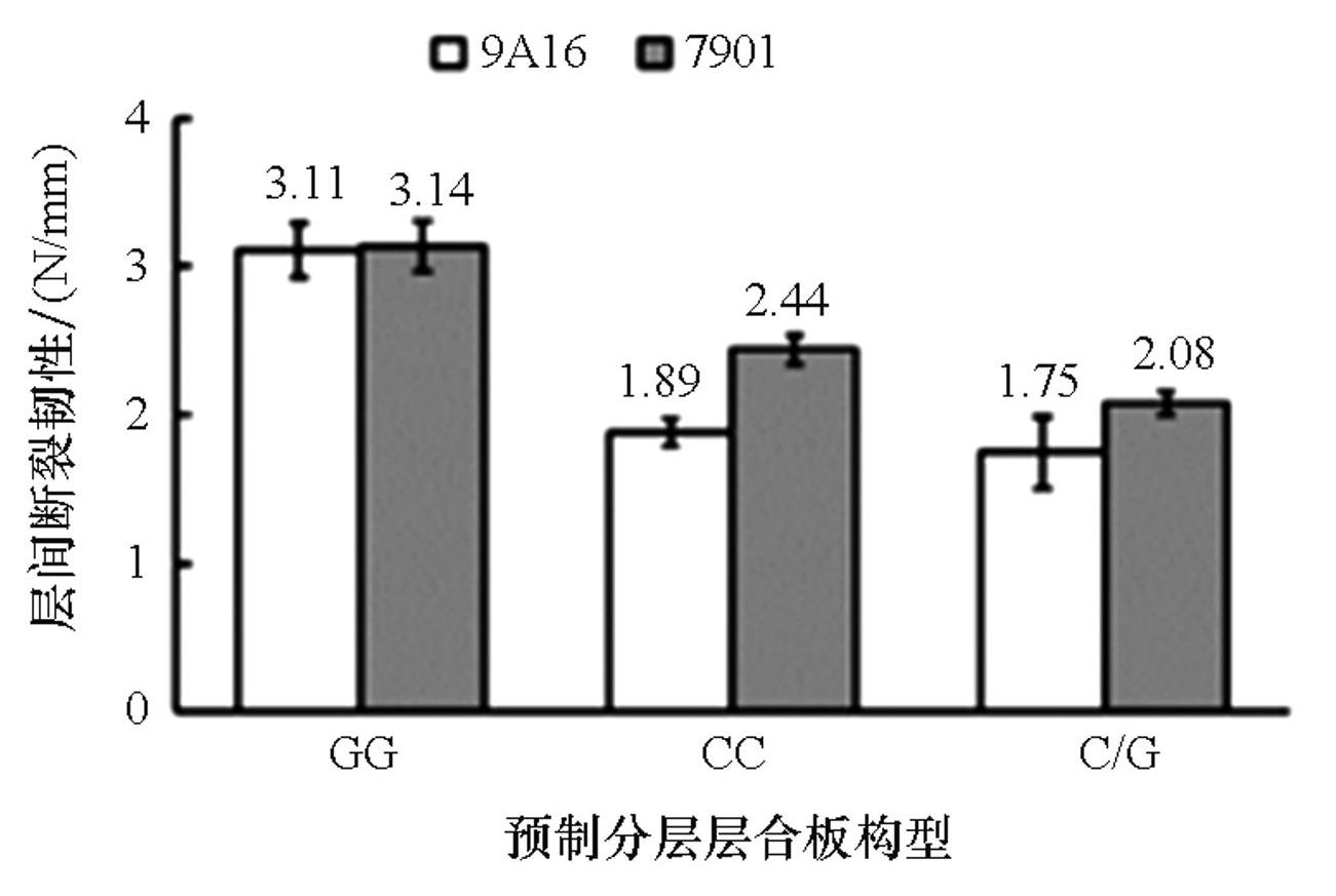 提高层间断裂韧性能够有效增加复合材料抗分层损伤的能力[10-13]。对于拉伸载荷下的碳/玻混杂复合材料,由于碳纤维失效应变小于玻璃纤维,因此,碳纤维层首先发生断裂。碳纤维层断裂后,碳纤维层和玻璃纤维层之间发生平行于拉伸载荷方向的相对位移,层间受剪切应力的作用,此时,形成的分层损伤为Ⅱ型(剪切型)分层损伤。因此,决定碳/玻混杂复合材料层间分层损伤扩展难易程度的性能参数是Ⅱ型层间断裂韧性(GⅡC)。