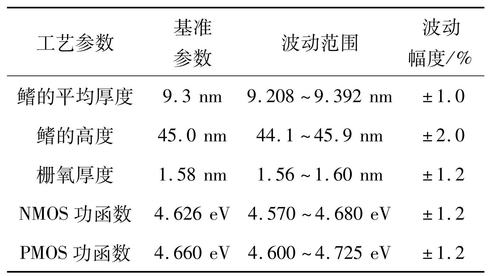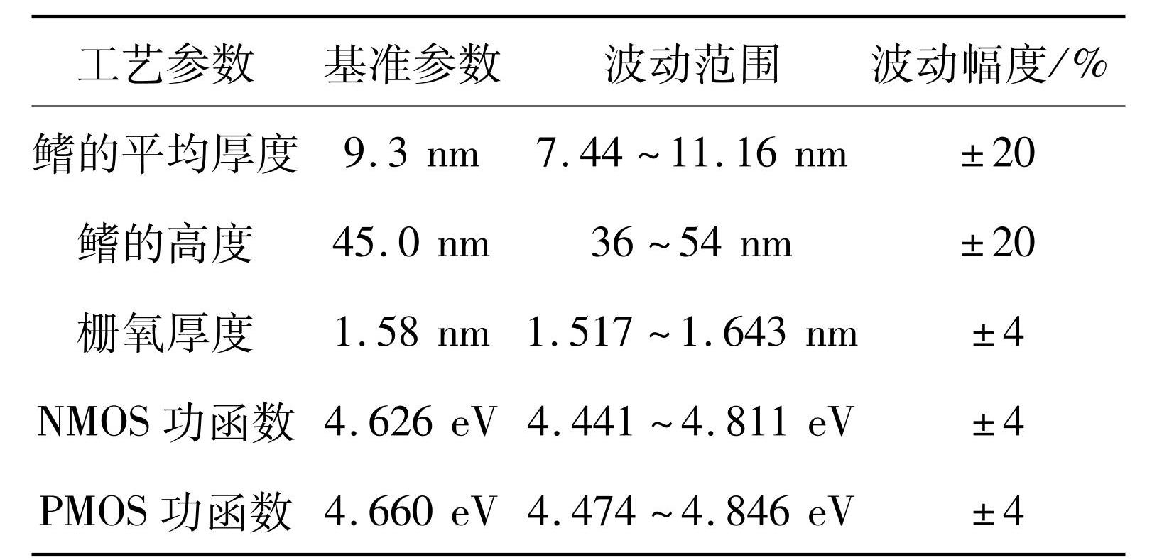 表4鳍的厚度、鳍的高度、栅氧厚度和功函数在某商用工艺中的变化范围