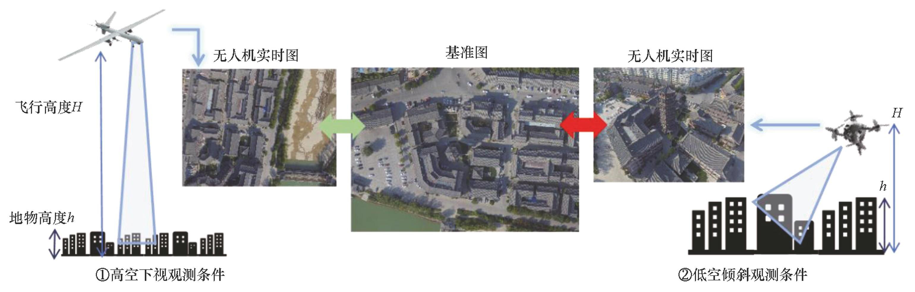 尽管无人飞行器绝对视觉定位研究已有数十年历史,但其应用主要集中于高空(飞行高度通常大于500 m)、正下视成像条件[10-11](如图1中插图①所示)。在此条件下,由于飞行高度远大于地面起伏程度且观测视角接近垂直,地表场景可被简化为二维平面,实时图与基准图间的几何关系主要体现为缩放、旋转和平移,能够用相似变换或单应性变换模型进行描述[12]。在高空下视成像条件下,基于图像匹配的飞行器定位算法[4,6]已能实现较高的定位精度与较强的鲁棒性。