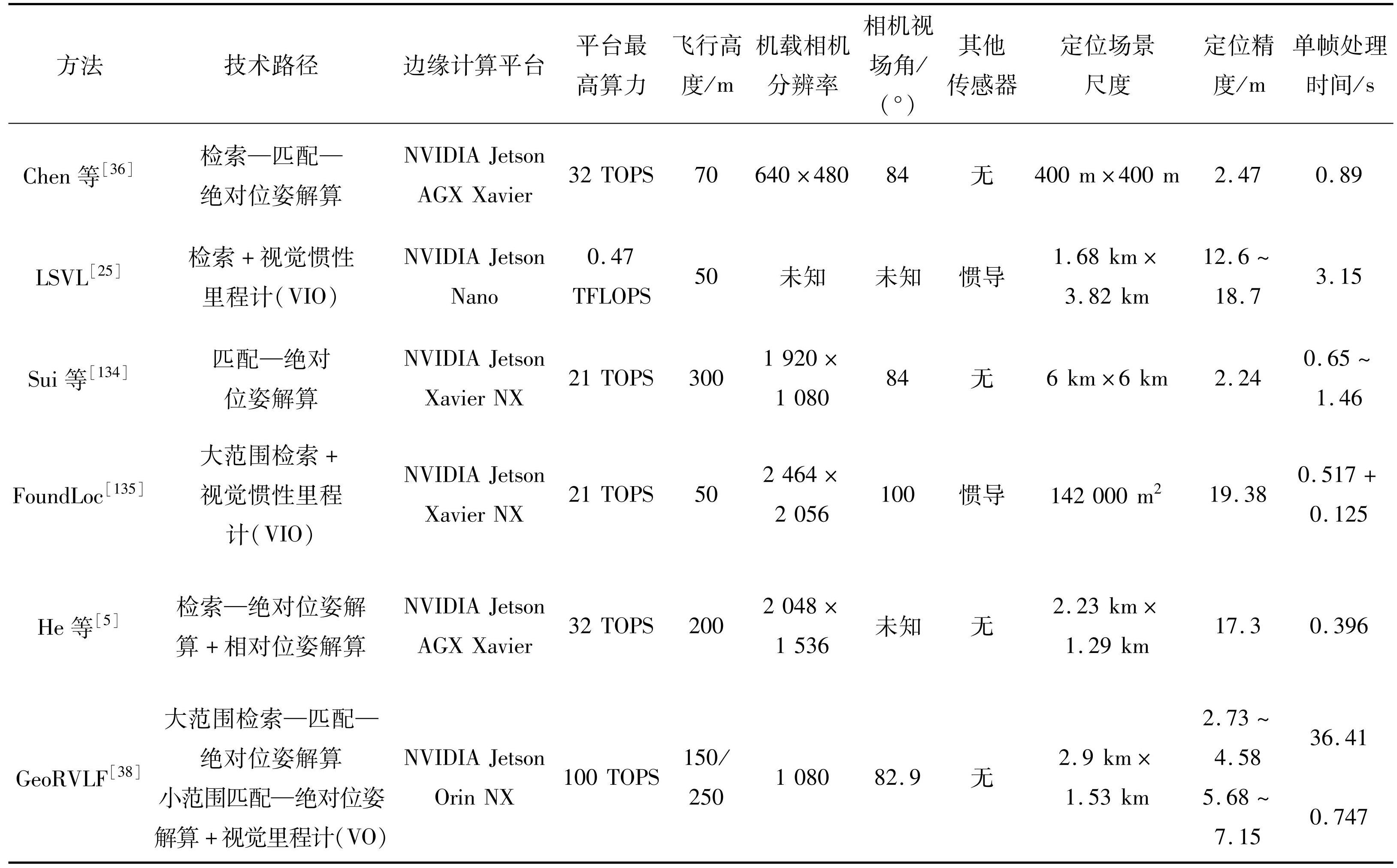 为了分析现有绝对视觉定位方法的能力和局限,对近年来在边缘计算平台上部署的基于深度学习的飞行器视觉定位方法进行了调研和总结(见表5)。从定位能力来看,大多数成功部署于边缘计算平台且精度达到米级的方法 [36,38],均采用了“检索—匹配—位姿解算”的框架。Sui等[134]的方案基于实时图初始帧位置已知的假设,因此未采用检索进行粗定位,这种策略虽然节省了计算资源,但依赖于准确的初始位姿先验。He等[5]的方案未进行像素级匹配和PnP解算,直接在图像检索的基础上通过Deep-LK(Lucas-Kanade)模块估计飞行器实时图与基准图间的单应性矩阵,进而推算飞行器的二维位置。然而,此类方法只适用于相机正下视成像且地面地形起伏不大的情况,在低空倾斜观测条件下通用性不足。从计算效率看,受限于边缘计算平台的算力与存储资源,现有方法的处理速度普遍较慢,单帧绝对视觉定位的最快处理速度通常在0.3 s以上。以He等[5]方法为例,尽管对基准图特征进行了离线提取与存储以降低计算负荷,但在NVIDIA Jetson AGX Xavier单帧处理时间仍需0.396 s。目前主流的光学相机成像速率通常快于0.02 s/帧,远高于后端视觉导航算法的处理能力,成像平台的实时感知能力与绝对视觉定位算法计算效率之间存在脱节。在飞行速度较慢且对定位精度要求不高的应用场景中,现有算法尚可满足基本需求。然而,对于高速飞行器,例如第一人称视角(first person view,FPV)无人机(速度>50 m/s[136]),当前算法的处理速度仍无法满足实时定位的要求。从各模块时间占用来看,检索通常是耗时最多的环节[5,38,135],限制了整个系统的运行频率。