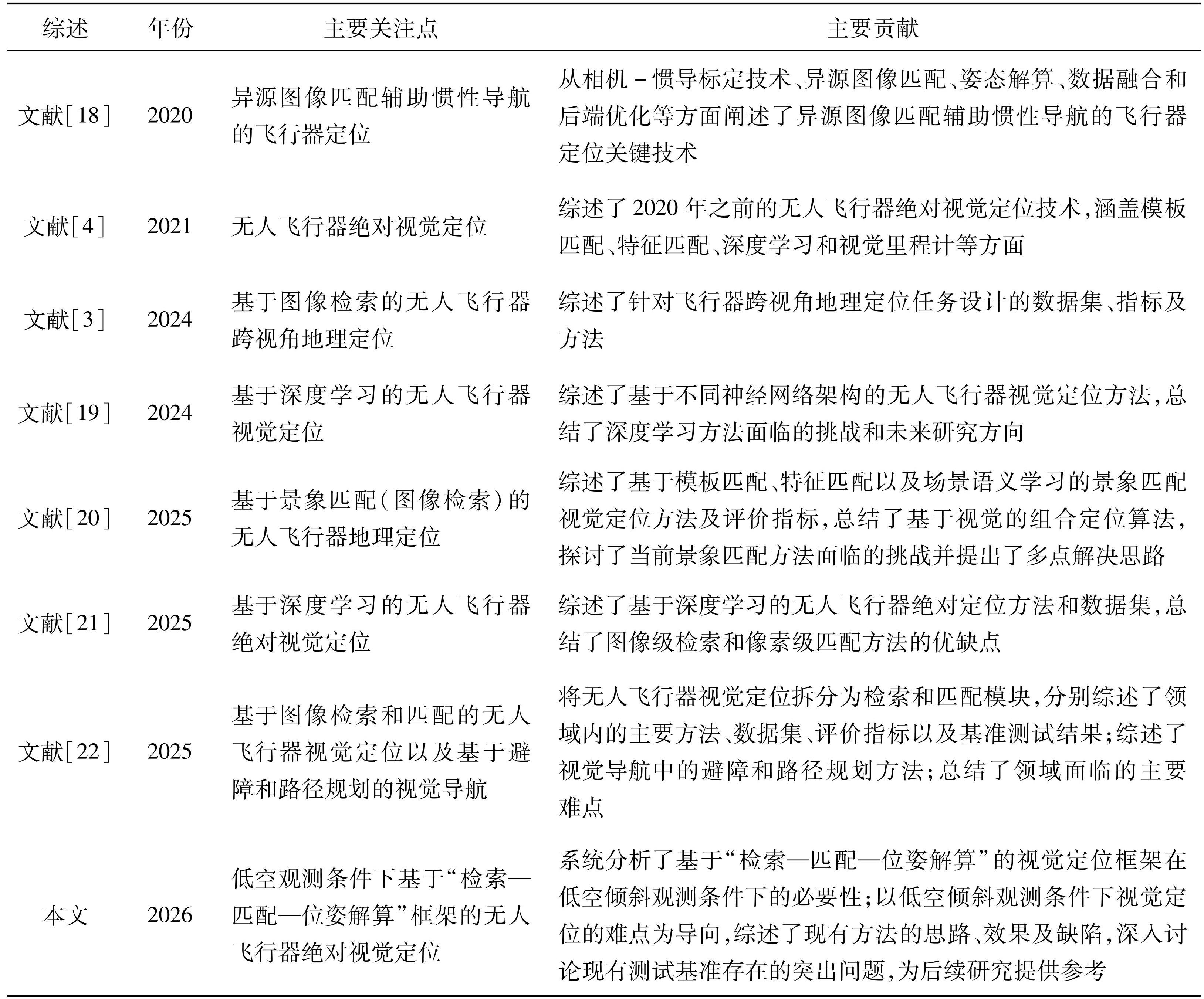 目前,无人飞行器应用场景正向低空、精细化方向发展,小型商业级无人机的飞行高度通常被限制在500 m以下,在执行目标侦察、基础设施巡检等任务时,常需进行低空倾斜观测以获取侧视信息(如图1中插图②所示)。在此条件下,地表场景的三维立体效应与透视形变显著,平面假设不再成立,实时图与基准图之间存在巨大视角差异。此外,低空成像还具有视场小、尺度变化快等特点,进一步增加了视觉定位的复杂度,原有针对高空下视成像的视觉定位方法已难以满足低空倾斜成像条件下的高精度视觉定位需求。近年来已有不少学者针对低空观测条件下的无人飞行器视觉定位问题提出了系列方法[12-15]和数据集[16-17],但现有技术的定位精度、鲁棒性和计算效率仍难以满足无人飞行器长航时自主飞行需求。此外,目前已有若干关于无人飞行器视觉定位的综述文献(见表1),但它们尚未全面覆盖低空视觉定位的关键技术模块。文献[18]概述了基于异源图像匹配和惯性导航融合的飞行器定位框架所涉及的关键技术;文献[4]系统分析了2020年前的绝对视觉定位技术,但未讨论基于深度学习的视觉定位方法;文献[3]总结了无人飞行器跨视角地理定位任务的数据集与评估指标,文献[19]从神经网络架构的视角进行分类综述,这两篇综述均未对低空倾斜观测条件下的挑战进行深入探讨;文献[20]只讨论了视觉定位中景象匹配面临的挑战;文献[21]与文献[22]将视觉定位流程拆分为检索与匹配两个模块进行论述,但未能系统阐述“检索—匹配—位姿解算”这一完整定位框架,以及该定位框架相较于端到端定位等其他框架的优势。针对低空观测条件下的显著视角差异与地物立体效应,相比于存在误差累积问题的相对视觉定位框架[4]、泛化能力受限的端到端直接定位框架[2]、依赖特定场景训练的无地图定位框架[23],以及对视角和尺度变化敏感的传统模板匹配技术[18],“检索—匹配—位姿解算”框架通过“分层解耦、由粗到精”的策略,能够有效兼顾搜索效率、定位精度与场景泛化性,是低空长航时绝对定位的稳健路径。