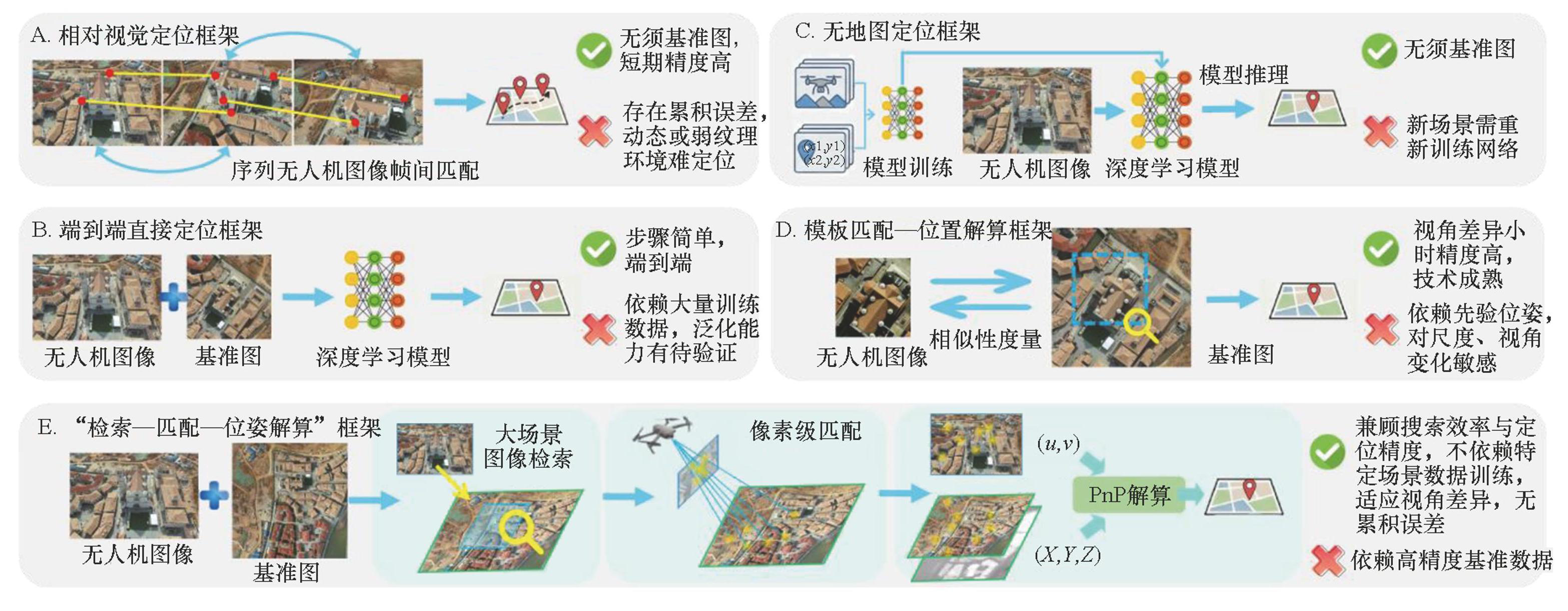 本文讨论的基于“检索—匹配—位姿解算”的框架[36]采用“由粗到精”的策略,在保证大范围搜索效率的同时兼顾定位精度,对视角与尺度变化具有良好的适应性。该框架具有多方面的比较优势:其绝对定位模式避免了累积误差;不依赖针对特定场景的训练数据,泛化能力强;对先验位姿的要求较低,能适应低空飞行中剧烈的视角与尺度变化。此外,从工程实践角度看,其模块化的设计便于独立优化与系统集成。这些综合优势为低空飞行器视觉定位提供了更为可行且稳健的技术路径。