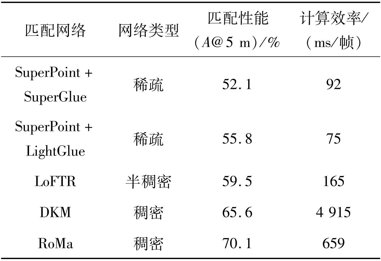 为量化分析不同匹配网络的性能,本文引用 Ye 等[27]在 AnyVisLoc 基准上的测试结果(见表2)。该实验在 NVIDIA 3090 GPU 上统一进行,以定位精度(A@T m)和单帧匹配时间为评估指标。结果表明,三类网络在效率与精度间存在权衡:稀疏匹配网络(如 SuperPoint+LightGlue)速度最快(75 ms/帧)但匹配精度较低;半稠密匹配网络(如 LoFTR)的匹配精度有所提高但计算开销进一步增大;稠密匹配网络(如 RoMa)的匹配用时约是SuperPoint+LightGlue方法的9倍。工程应用中需要根据实时性要求和资源约束进行网络选型。