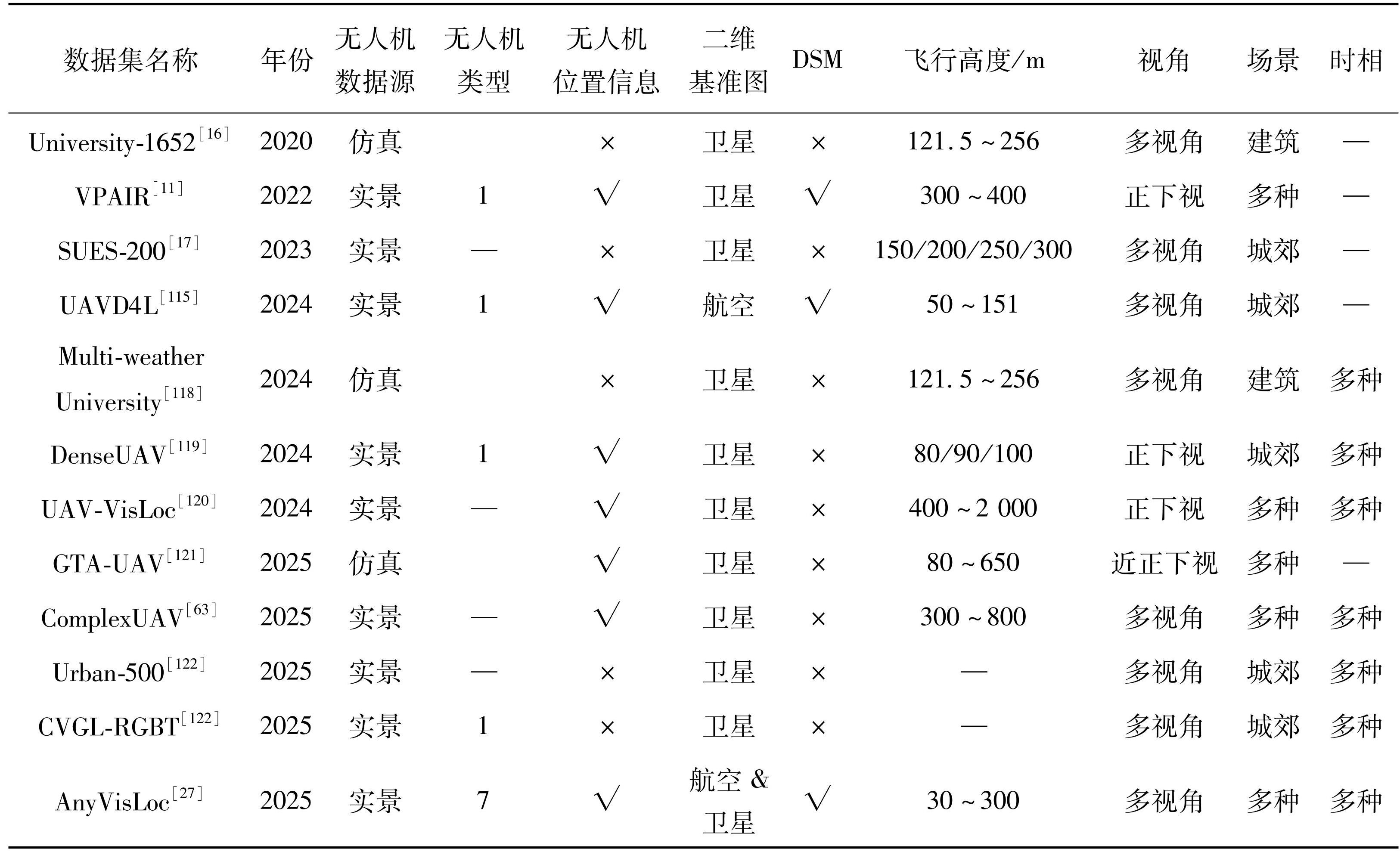 早期的研究受限于数据获取成本,多采用仿真或有限的实景数据。University-1652[16]通过谷歌地球仿真生成了全球72所大学的建筑物场景,但成像时的天气、光照等环境条件较为单一。为了弥补环境多样性方面的不足,Multi-weather University[118]在此基础上引入了多种天气条件的仿真,GTA-UAV[121]则利用游戏引擎生成了包含丰富纹理和光照变化的仿真数据。然而,仅依靠仿真难以完全覆盖真实世界的复杂变化。随着无人机技术的普及,越来越多的实景数据集被提出。SUES-200[17]采集了不同高度(150~300 m)的无人机图像,重点关注飞行高度变化对检索的影响,但其场景主要局限于城郊,且视角变化相对有限。DenseUAV[119]涵盖了80~100 m间不同高度的实拍数据且采样频率更高,UAV-VisLoc[120]包含城市、农村等11个不同场景,但这两个数据集仍以下视成像为主,无法满足低空倾斜观测的定位需求。针对低空倾斜观测这一更通用的场景,部分数据集开始关注多视角与复杂场景的结合,比如:UAVD4L[115]与ComplexUAV[63]提供了多视角的实景无人机图像。最新的AnyVisLoc[27]数据集则在多视角、多场景、多时相以及飞行高度覆盖范围(30~300 m)上进行了全面拓展,并提供了精确的无人机位置信息与DSM。该数据集不仅支持粗粒度的图像检索,也为后续的精细化位姿解算提供了可能,是未来研究的重要基准。