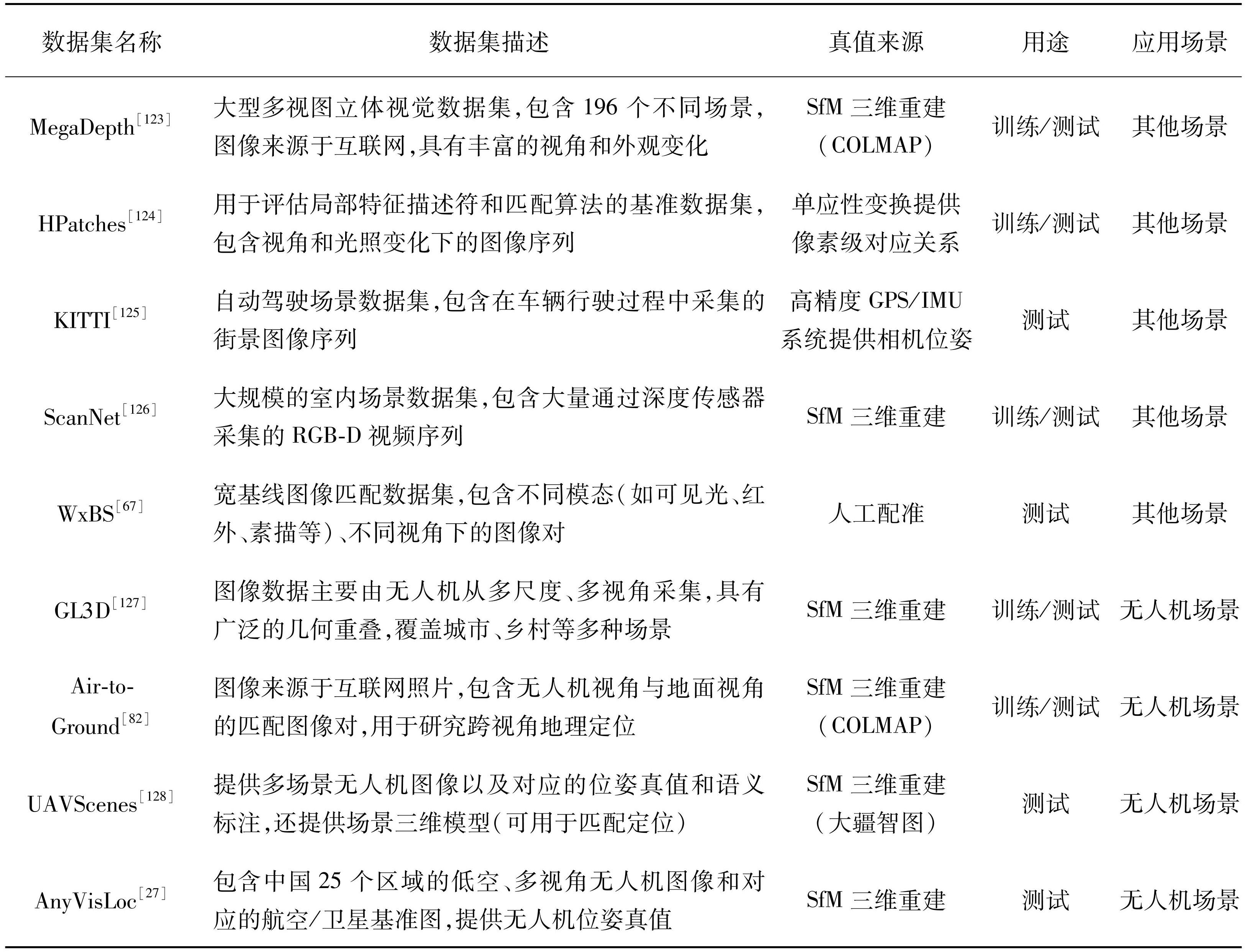 表4归纳了主流的跨视角图像匹配数据集[27,67,82,123-128],现有数据集在数据多样性和真值有效性方面做出诸多努力但仍存在一些问题。WxBS数据集[67]通过人工标注保证真值精度,但是由于人工标注的高昂成本,该数据集仅有37对图像,难以支持大规模训练。为降低人工标注成本,MegaDepth[123]与Air-to-Ground[82]等数据集利用网络开源图像和三维重建技术(如COLMAP)生成数据。这种方法扩大了数据规模但其真值精度受三维重建质量限制。即便是COLMAP这类先进软件,在处理存在显著模态和视角差异的图像对也容易引入误差。虽然一些研究会额外设计策略来滤除置信度较低的匹配点对(比如RoMa方法[91]在训练过程中引入深度连续性约束来滤除MegaDepth数据中不可靠的匹配点对),但这类后处理策略无法从根本上消除真值噪声。此外,一些无人机飞行模拟器(如AirSim[129])以及三维渲染器(比如Unreal Engine 和Google Earth)也常被用来生成仿真图像,这些数据已在图像检索[120]以及视觉语言导航[130]等领域中被采用,但主流的跨视角图像匹配网络很少采用此类数据训练[82,90-91,101],可能原因在于其难以模拟真实场景中的复杂光照与瞬时变化,从而限制了模型的泛化性能[131]。