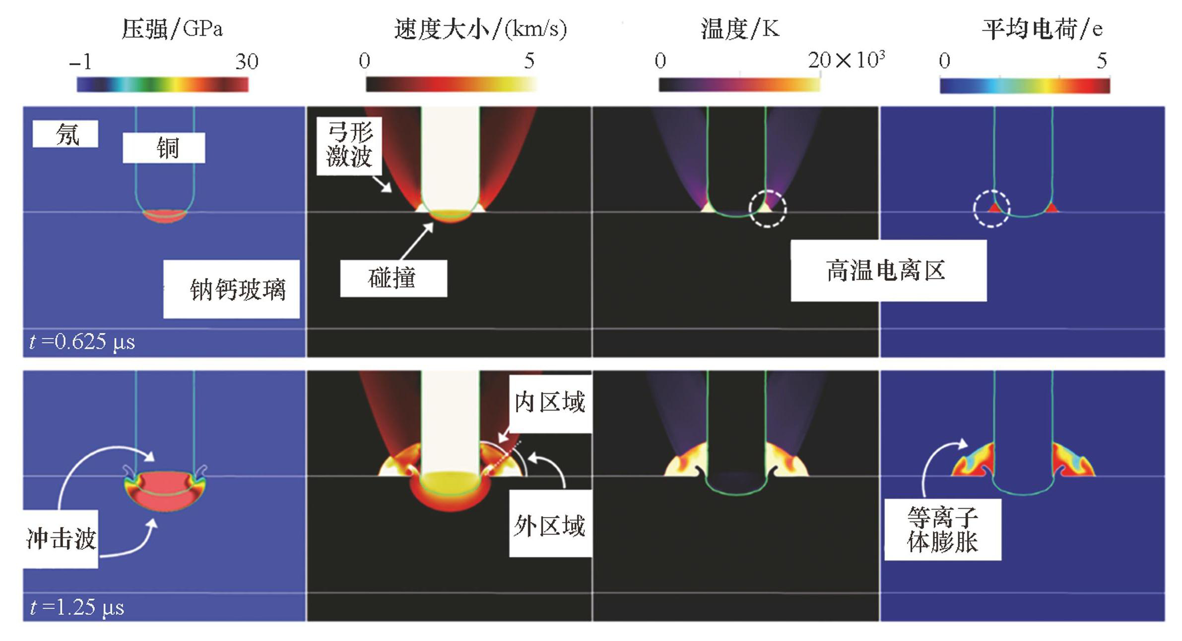 随着计算技术的发展,基于流体动力学框架的数值模拟成为宏观研究的主流。其中,光滑粒子流体动力学(SPH)方法因其在处理大变形、材料断裂和自由界面问题上的天然优势而被广泛应用。Song等[53-56]和Fletcher等[57]利用SPH方法,结合复杂的物态方程,成功模拟了碰撞过程中的温升、熔化、气化过程,并预测了等离子体电子密度和电子温度的宏观分布,如图7所示。这类方法能够很好地复现撞击坑形貌和喷射物云的整体形态,但其核心局限在于,电离过程本身是被唯象地包含在物态方程中的,可能无法精确描述冲击瞬间高度非平衡的电离动力学。