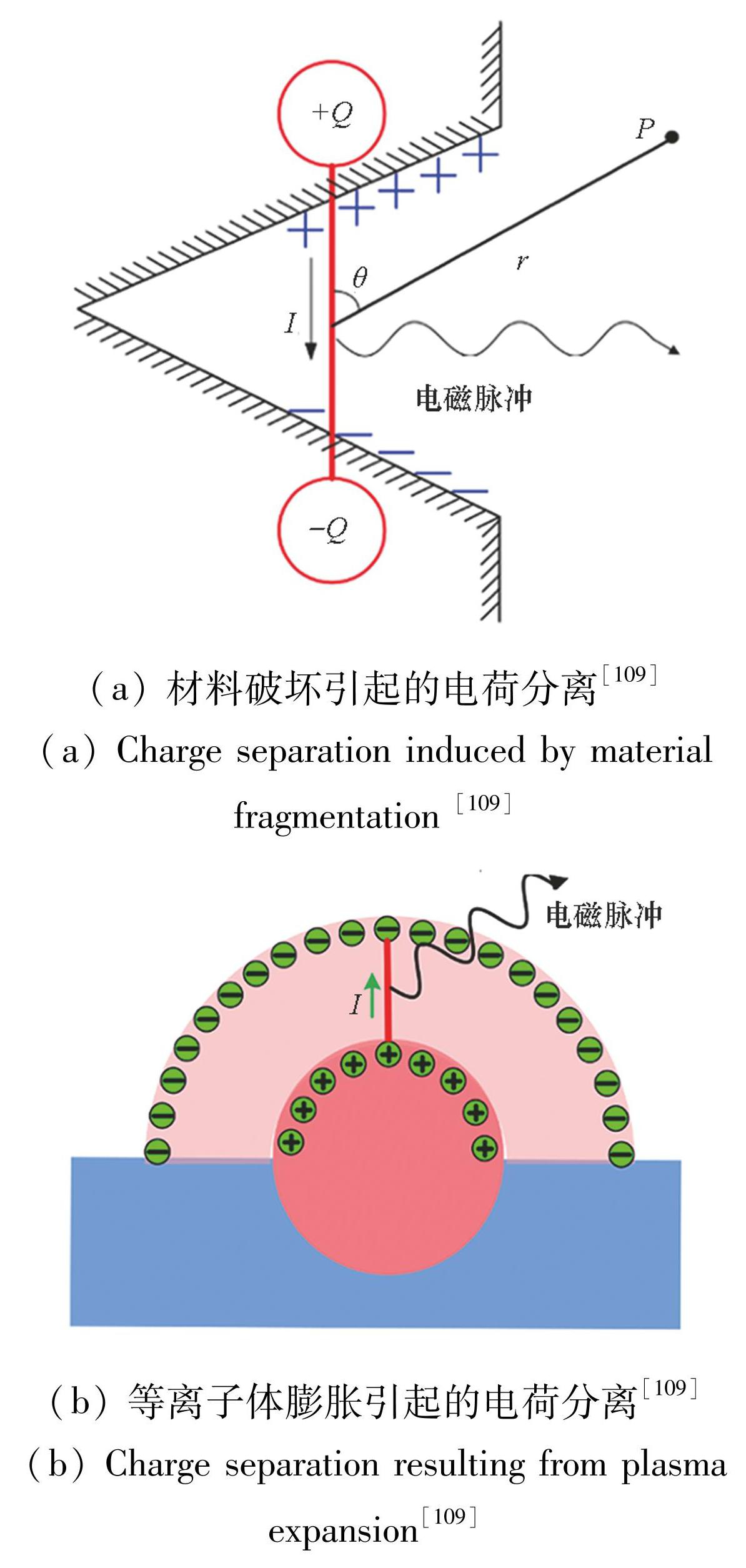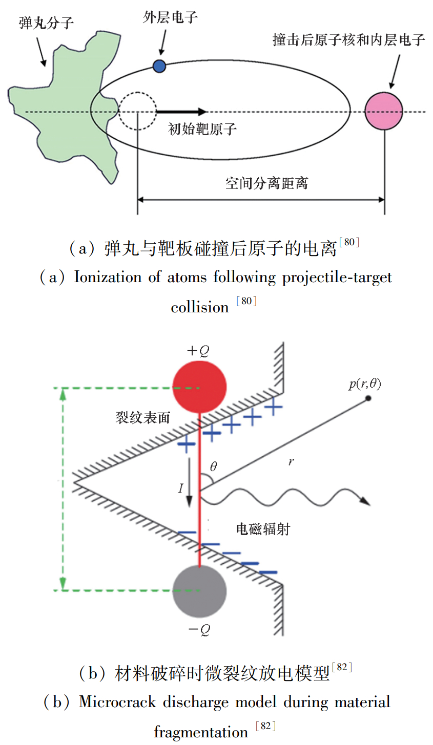 第一种机制将电磁信号的来源归因于材料在冲击载荷下发生断裂的直接产物。早期的实验,如Bianci首次探测到超高速撞击电磁辐射[78],Foschini认为撞击产生的电磁辐射能够破坏卫星电子设备[14],Takano等的实验都观察到了与撞击过程相关的微波信号[79-80]。Maki等的研究发现微波辐射与光发射在时序上存在显著差异,且信号呈现间歇性的尖锐脉冲形态,这似乎与等离子体云的平滑膨胀图像不符[81-82]。 Ohnishi等[83]利用轻气炮加速尼龙弹丸至4 km/s附近撞击不同厚度(1~40 mm)不同材料的金属靶,采用外差探测法检测微波信号,并结合Maki等提出的微裂纹表面的放电模型进行分析。研究表明,微裂纹放电所需的自由电子来源于两种激发模式:一是冲击产生的高温所导致的热电子发射;二是冲击能量直接破坏靶材的晶格结构,即原子间化学键的断裂,从而激发电子。基于这些观测,研究者提出了“碰撞极化/电离模型”[80](如图9(a)所示)和“微裂纹放电模型”[82](如图9(b)所示)。该理论认为,在强冲击波作用下,材料内部的晶格破坏或微裂纹扩展导致局部电荷分离,最终通过微型放电产生宽带电磁辐射。