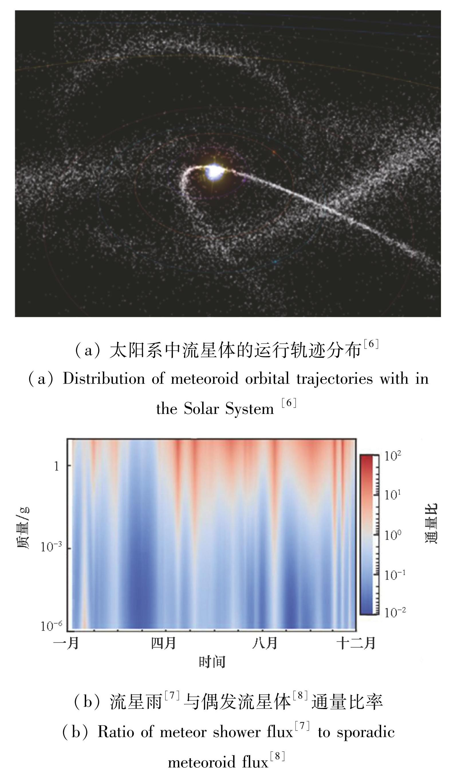 除人造碎片外,空间中还遍布着天然存在的微流星体(micrometeoroids)。这些主要起源于彗星和小行星的尘埃颗粒,在太阳系内高速穿行。如图2所示,图2(a)描绘了主要流星群的运行轨迹,当它们的轨道与地球轨道相交时,便会在特定时期内显著增高地球附近的粒子通量[6]图2(b)则定量对比了流星雨流星体[7]与全年持续存在的偶发流星体[8]所贡献的通量,显示了微流星体来源的复杂性与多样性。