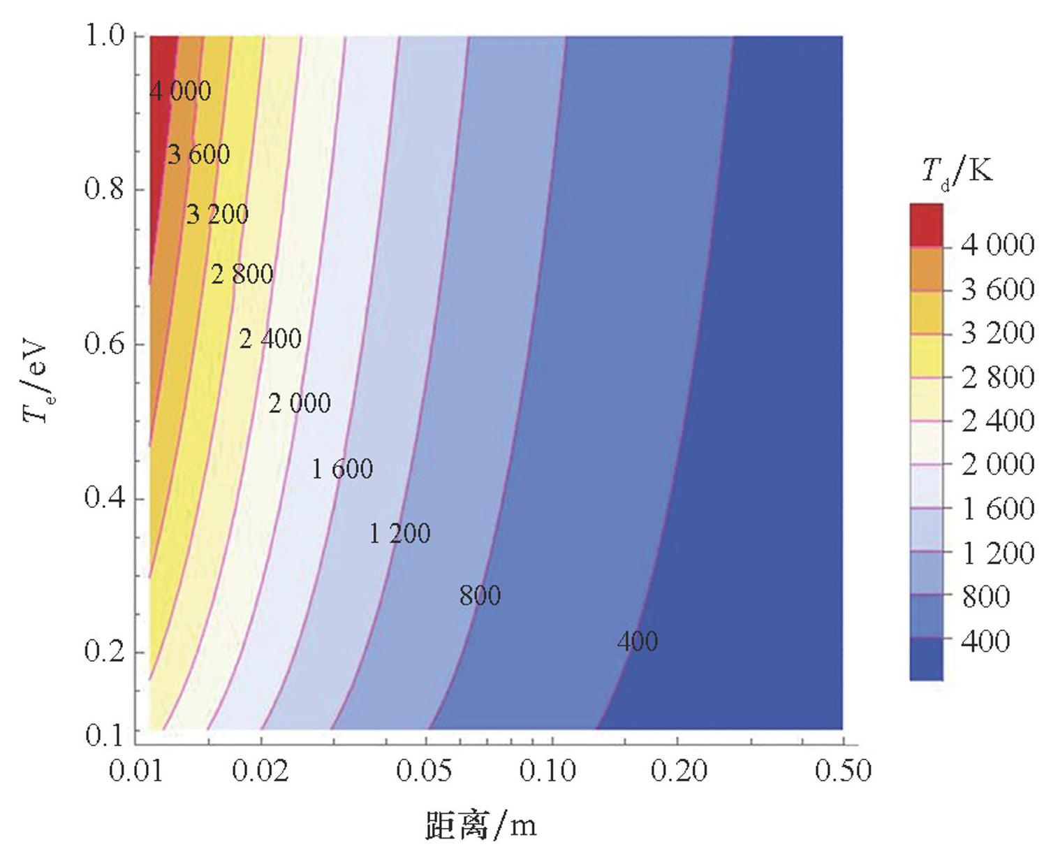 7超高速撞击钨靶产生的等离子体电子密度和电子温度随空间和时间的分布 (撞击速度20 km/s,撞击角度45°)[57]