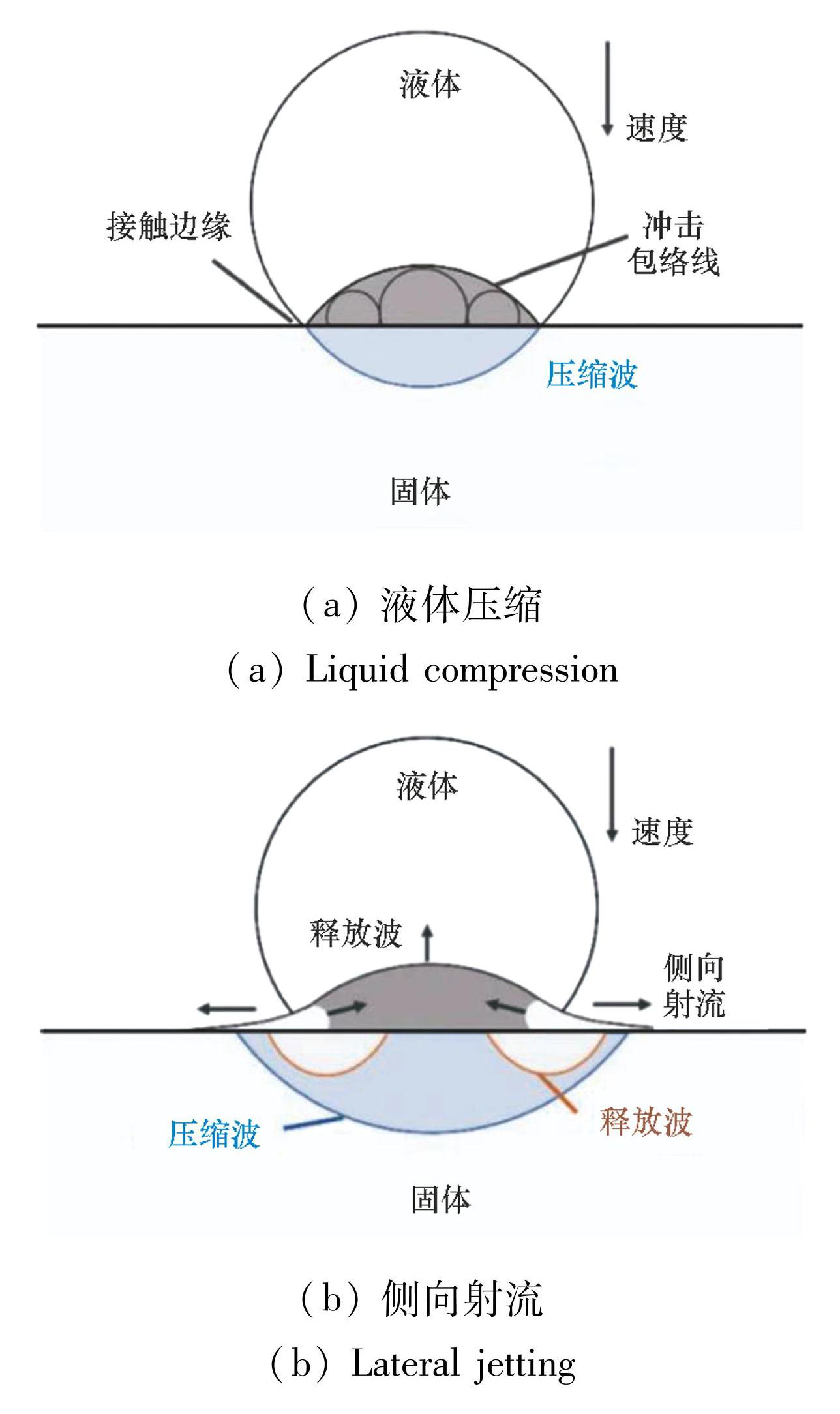 随着冲击过程推进(持续时间通常小于微秒量级),当液滴内部冲击波速接近并超过接触边界扩展速度时,压缩波前缘脱离边界约束,形成向液滴内部及固体内部传播的卸载拉伸波,此时进入侧向射流阶段,如图1(b)所示[13]。压缩液体在卸载过程中沿固体表面形成高速侧向射流,对材料表面产生强烈剪切作用,可直接撕裂表面微凸体,引发塑性变形与裂纹扩展。侧向射流是雨蚀损伤的关键诱因,其速度通常数倍于初始冲击速度,部分测量结果显示可达数十倍[18]。射流表面特性与速度是决定该损伤机制严重程度的关键因素[19]
