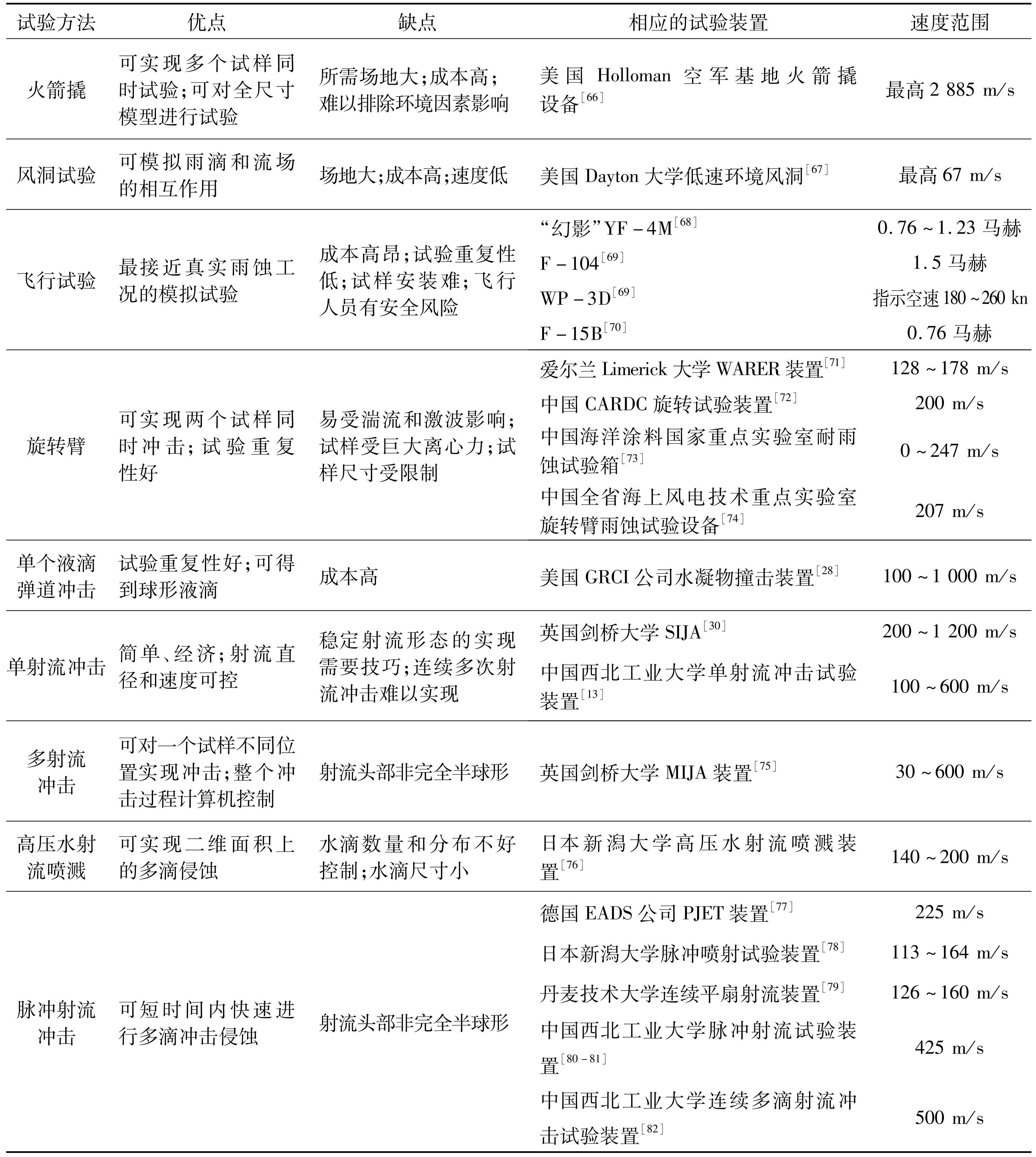 目前,模拟雨蚀的试验方法大致可分为三类:第一类是模拟真实雨场,使试样结构受到大范围连续水滴冲击,例如风洞、火箭撬等(即试样和水滴均处于运动状态);第二类是保持水滴相对静止,通过加速试样来实现两者的高速撞击,如旋转臂、弹道试验等(即试样运动,水滴静止);第三类则是利用试验装置加速水滴至高速,随后撞击试样以实现冲击加载,如单射流或多射流装置(即试样静止,水滴运动)。表2总结了现有各种雨蚀试验方法的特点。以下将对这三类雨蚀试验方法中的典型设备进行详细介绍。