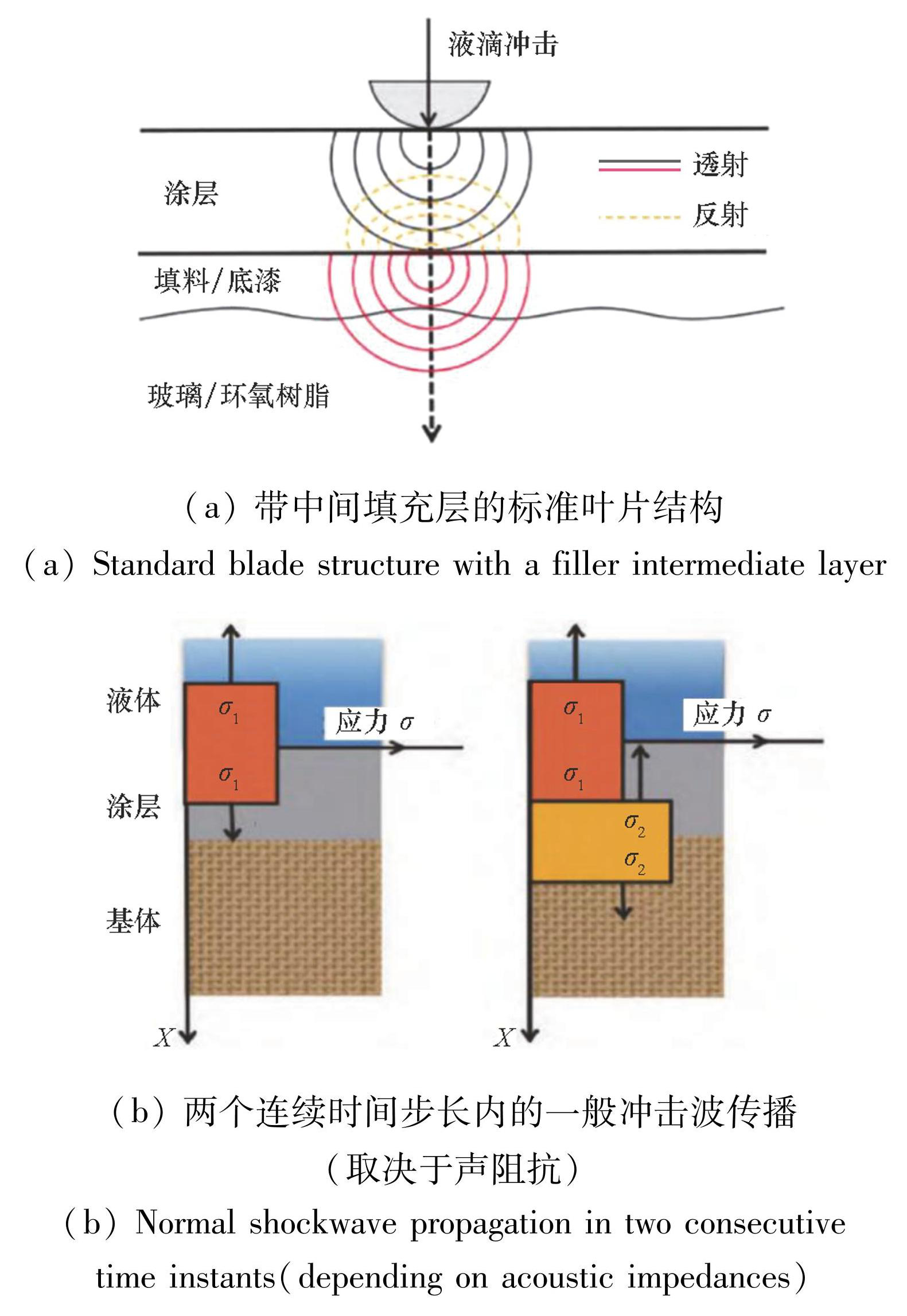 液体冲击压力作为载荷,会在靶体内部激发纵波(压缩波)、横波(剪切波)与瑞利波(表面波)三种应力波。其中,瑞利波沿表面传播且携带约2/3的冲击能量,是诱发表面材料疲劳与裂纹萌生的核心因素[20]。在雨蚀防护研究中,涂层材料的应用是关键技术方向[21]。高速雨滴冲击引发的材料失效,不仅涉及表面直接力学损伤,更与应力波在材料内部的传播行为密切相关[22]。应力波的传播与损伤效应,受材料力学响应、表面处理工艺、涂层特性及层间相互作用等多因素耦合影响:如图2(a)所示,应力波在涂层-基体界面会发生反射、透射与能量分配;当冲击波作用于涂层时,会形成分别向液体介质与涂层内部传播的独立波阵面,如图2(b)所示。其中,沿法向入射的应力波向涂层-基体界面传播,过程中部分应力波反射回涂层,其余则透射进入基体。当应力波在材料内部遇到微观缺陷(如孔隙)或声阻抗不匹配界面(如涂层-基体界面)时,会进一步发生反射与透射,反射波可能形成拉伸应力,若该应力超过材料动态拉伸强度,将引发材料损伤或界面脱粘[23]