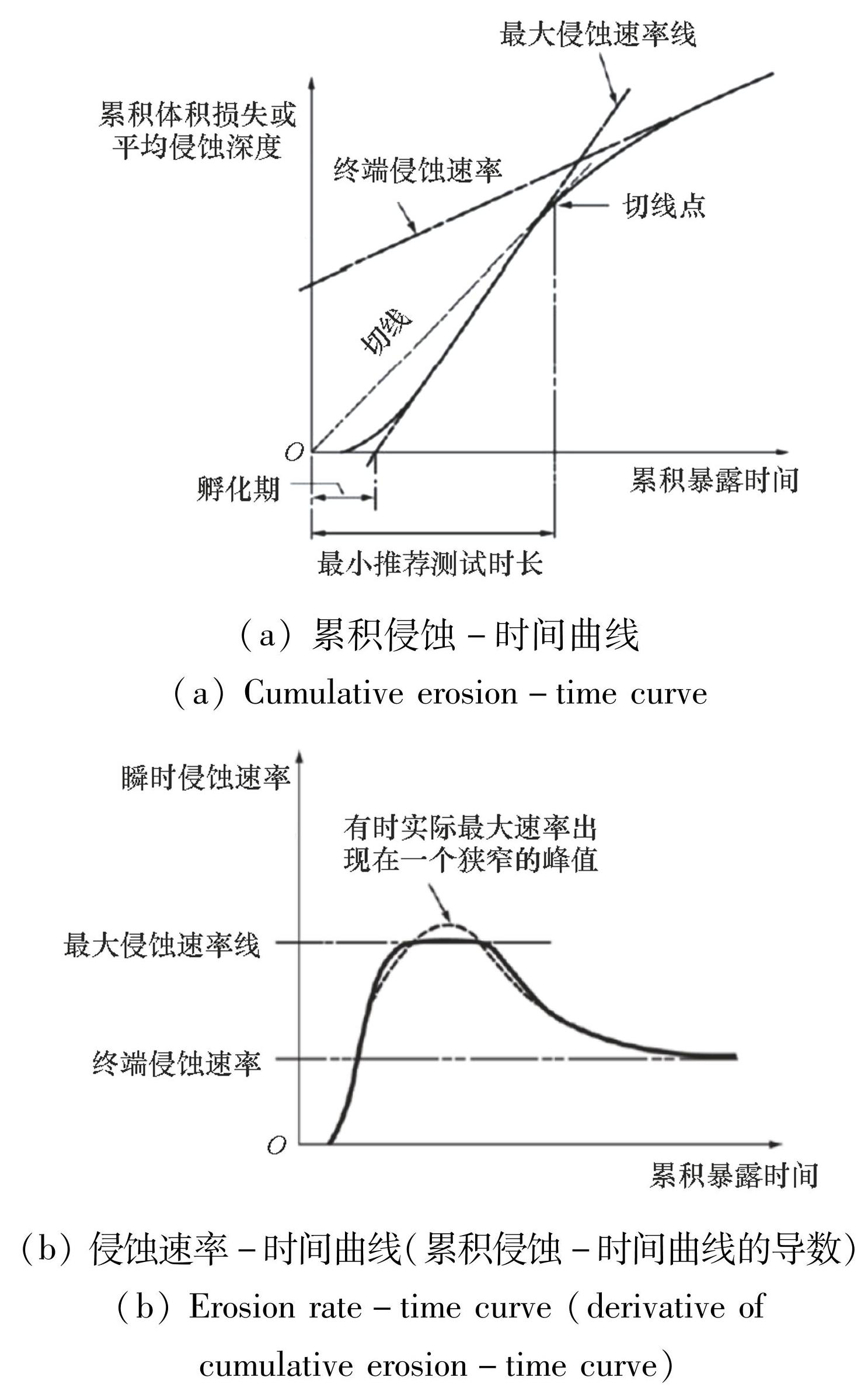 根据ASTM G73-10标准[34],水滴侵蚀是一个典型的随时间演变的累积损伤过程,其质量或体积损失随时间变化的曲线通常呈现“S”形。特征侵蚀曲线通常分为五个部分:①潜伏阶段;②加速阶段;③最大侵蚀速率阶段;④衰减阶段;⑤终结稳态阶段。该曲线的横坐标“暴露量”可表示为时间、冲击周期、撞击水滴体积、有效撞击水滴数量或累积撞击动能;纵坐标“累积材料损失”可采用质量损失或体积损失——对比不同材料时优先选用体积损失,分析测试参数对同种材料侵蚀行为的影响时,二者均可使用。标准明确,可采用基于经验关系确定的“潜伏期”与“最大侵蚀速率”作为材料抗雨蚀性能的评级依据。“潜伏阶段”是侵蚀过程的起始阶段[35],尽管材料内部已因重复冲击产生微观损伤(如微塑性变形、微裂纹形核),但尚未出现可测量的质量损失,即质量损失可忽略不计,宏观表现为表面粗糙度缓慢增加。潜伏期持续时间可通过以下公式表示: