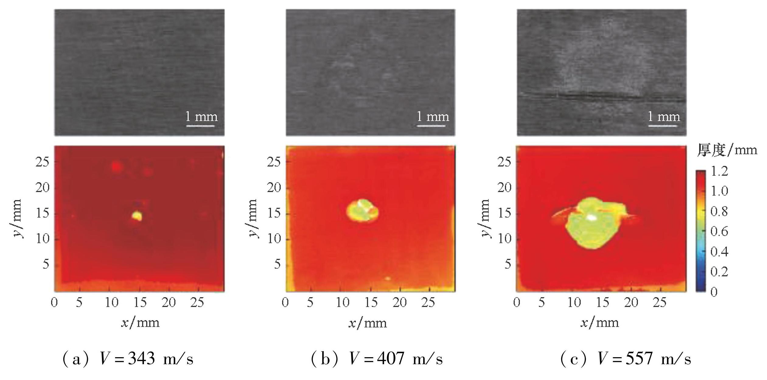 Fig.4Microscopic and C-scan results of composite material specimens impacted by jets of different velocities with a diameter of 5.7 mm[13]
