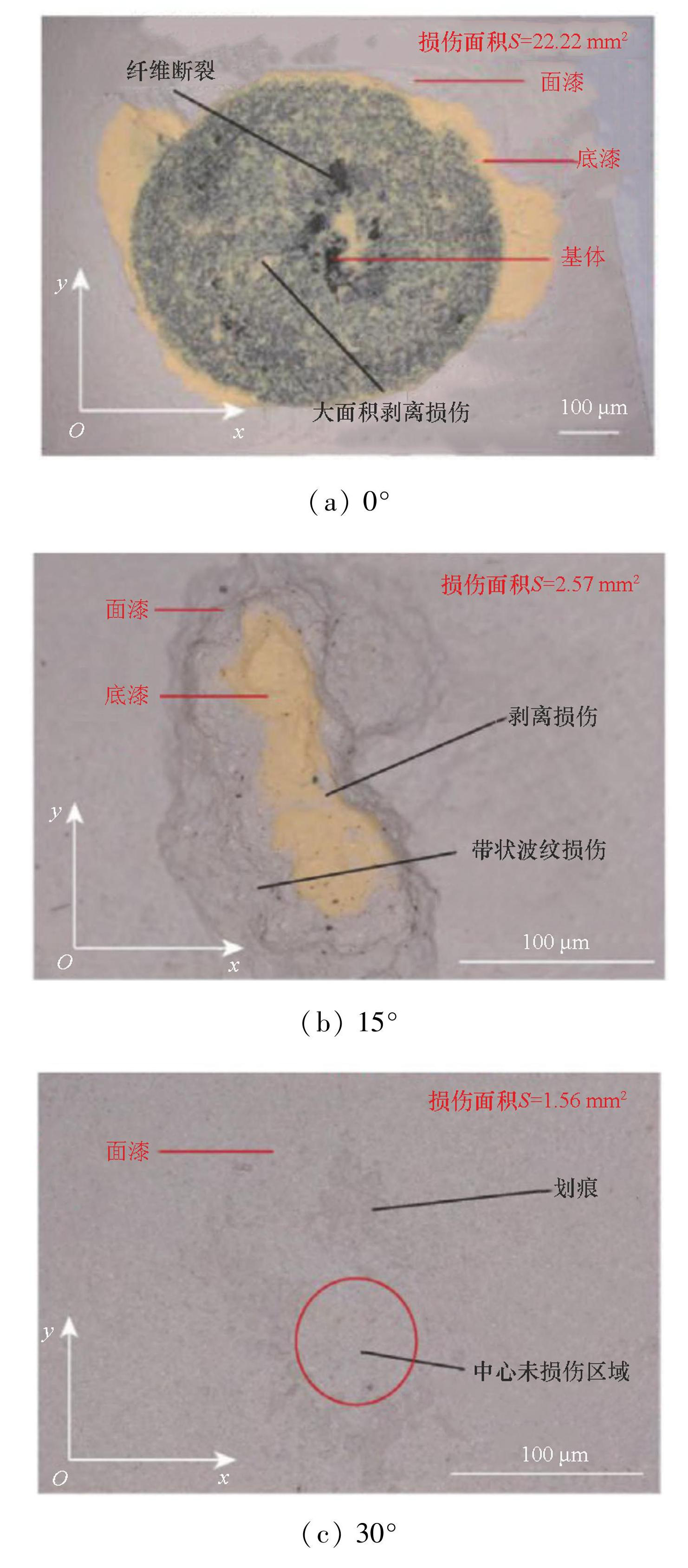 Fig.6Damage morphology of coating materials under different impact angles[27]