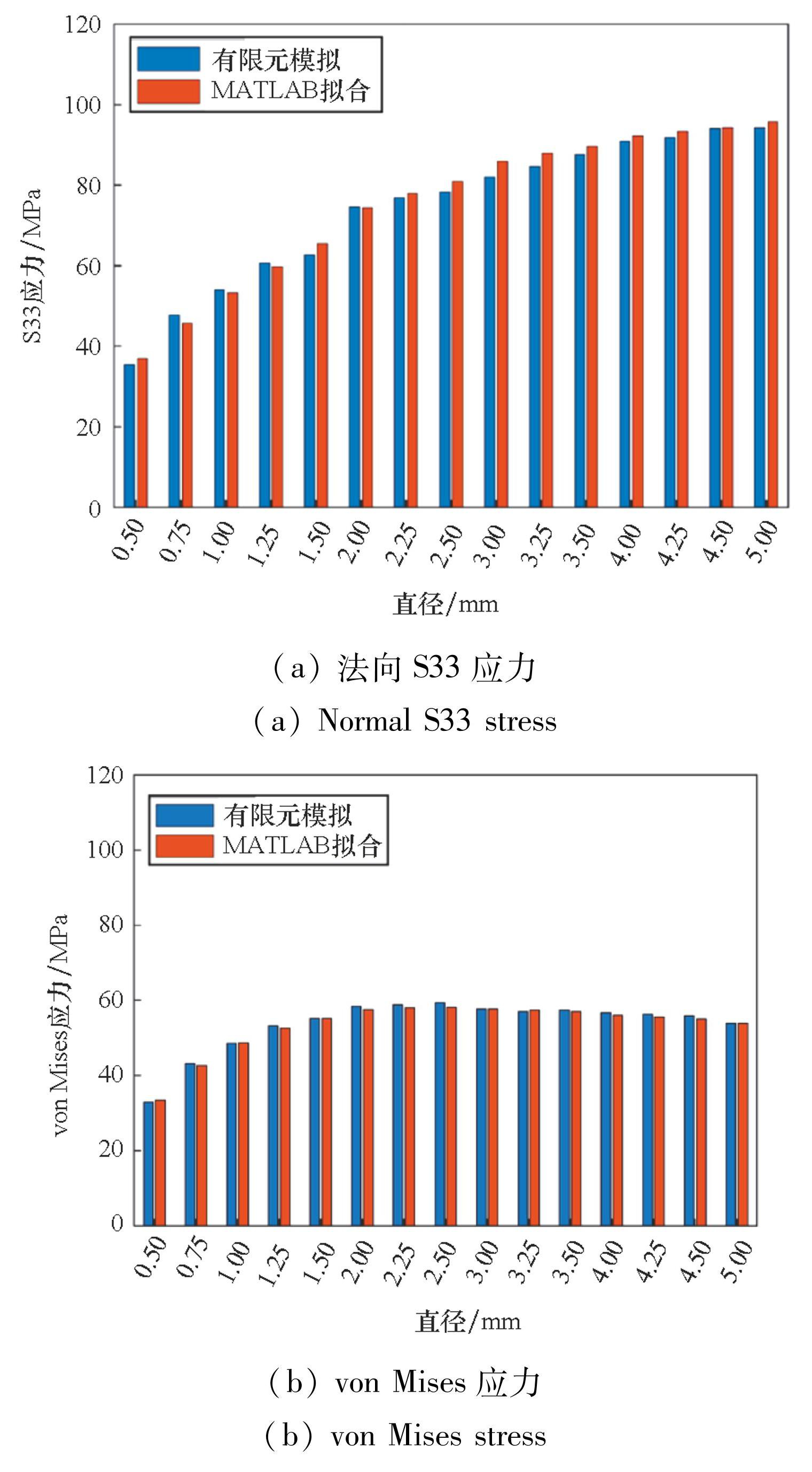 学者们利用实验和仿真研究共同分析了液滴尺寸对雨蚀损伤的影响规律。Bech等[51]针对玻璃纤维环氧树脂试样表面商业聚氨酯基面漆的研究(液滴直径0.76~3.5 mm)表明:速度-单位面积撞击次数与速度-单位面积撞击水量曲线的斜率随液滴尺寸减小而降低,即液滴尺寸越大,潜伏期结束时所需撞击次数越少。Hoksbergen等[52]通过数值仿真研究了液滴直径对动态压力的影响,结果表明,不同直径液滴的最大冲击压力相近,但液滴越大,受压力影响的区域范围越广、压力作用时间越长;这两种效应均与液滴曲率相关,最终导致靶体材料应力分布差异。Oddo等[16]开发了数值模型用以预测水滴撞击引发的叶片侵蚀效应,结果如图8所示:随液滴直径增大(0.5~5 mm),法向S33应力单调递增,其原因在于大液滴更高的动能与质量易造成垂直方向局部严重损伤;而von Mises应力呈先增后减趋势,在直径2.5 mm时达到峰值,此时主应力与剪应力耦合作用最强,最易引发材料破坏与变形。