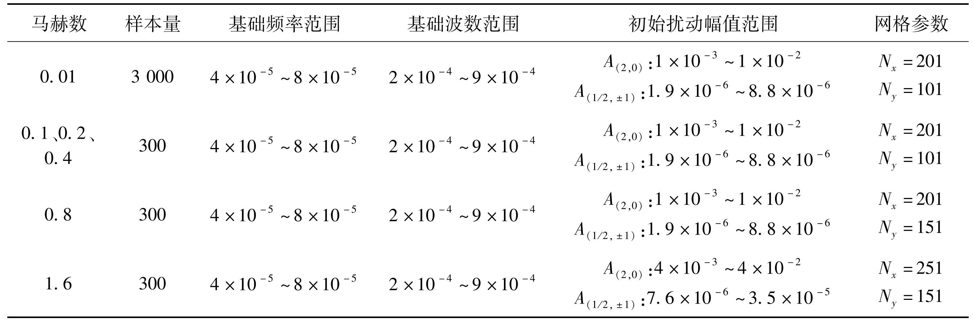 为评估跨马赫数条件下转捩位置预测的可迁移性,设置了六组自由来流马赫数,分别为Ma=0.01,0.1,0.2,0.4,0.8,1.6。其中Ma=0.01作为源域,其余五组作为目标域。在每一组工况内,围绕基础频率、基础波数与初始扰动幅值构造参数空间,通过随机抽样生成多样化样本。计算参数的具体设置见表1。A(m,n)表示对频率为mω、展向波数为nβ的扰动模态所施加的初始幅值,Nx、Ny则分别代表在流向和法向的网格点数。所有工况下的流向范围均设置为378~2 500(对应雷诺数为378~972),以保证不同工况之间的可比性,并在展向施加4个周期。