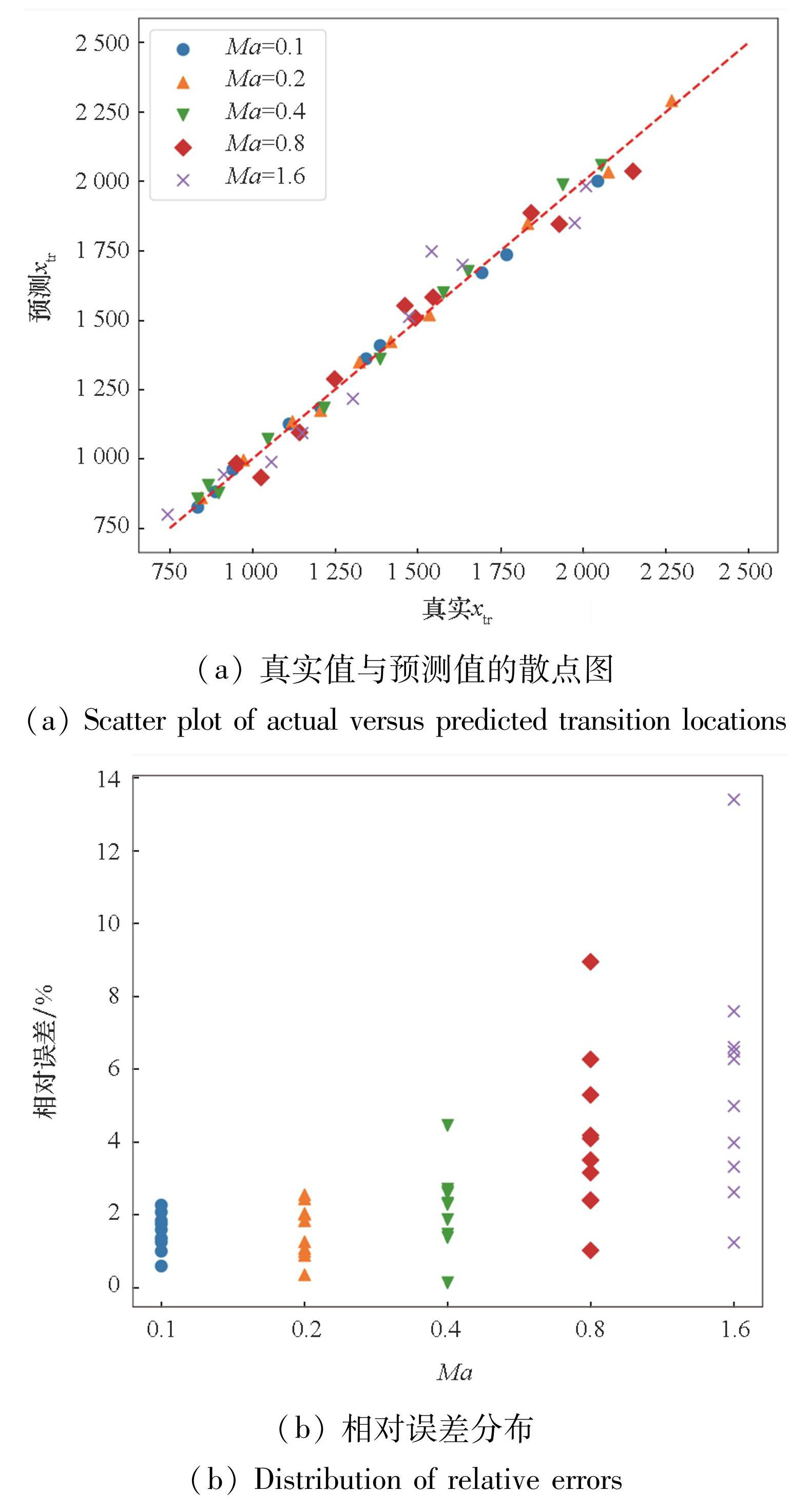 为进一步直观展示模型在不同马赫数下的预测效果,针对目标域中五组马赫数,在训练样本数量为250的情况下,各随机选取了10个测试样本进行模型评估。如图8所示,展示了真实转捩位置与预测转捩位置的散点图(图8(a))以及相应的相对误差分布(图8(b))。结果表明,迁移学习模型在较低马赫数下表现出较高的预测精度,样本点紧密分布在对角线附近;随着马赫数的增加,预测误差略有增大,但相对误差整体保持在较低水平。由此进一步验证了迁移学习方法在跨马赫数转捩位置预测中的有效性。