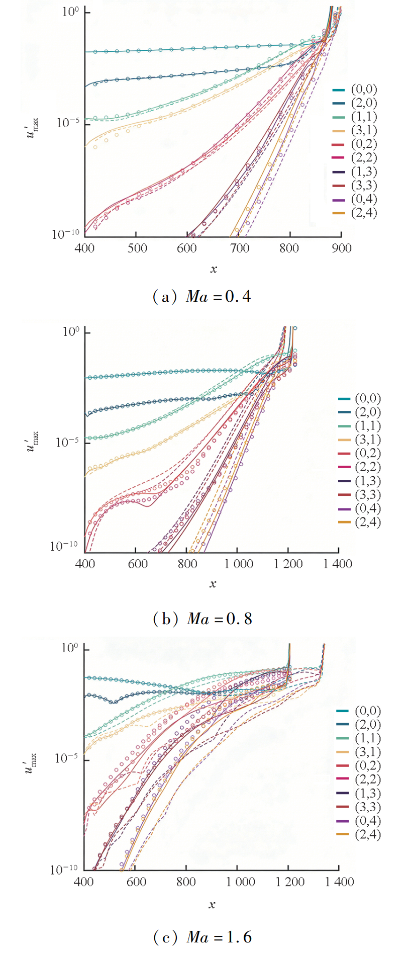 计算完成后,图1展示了不同马赫数下扰动速度在法线方向上的幅值最大值u′max沿流向位置的演化。图中不同颜色表示不同扰动模态,虚线、实线和圆圈分别代表粗网格、中网格和细网格的结果。可观察到粗网格的结果在转捩位置上存在明显偏差;而中网格与细网格的结果在主模态发展趋势上几乎一致,仅在高阶模态部分存在细微差别。因此,可以认为中网格已具备足够的空间分辨率。但需要说明的是,出于计算资源与效率的权衡,本文仅在部分算例中开展了网格收敛性检验,研究重点在于迁移学习方法及图案识别策略的可行性。