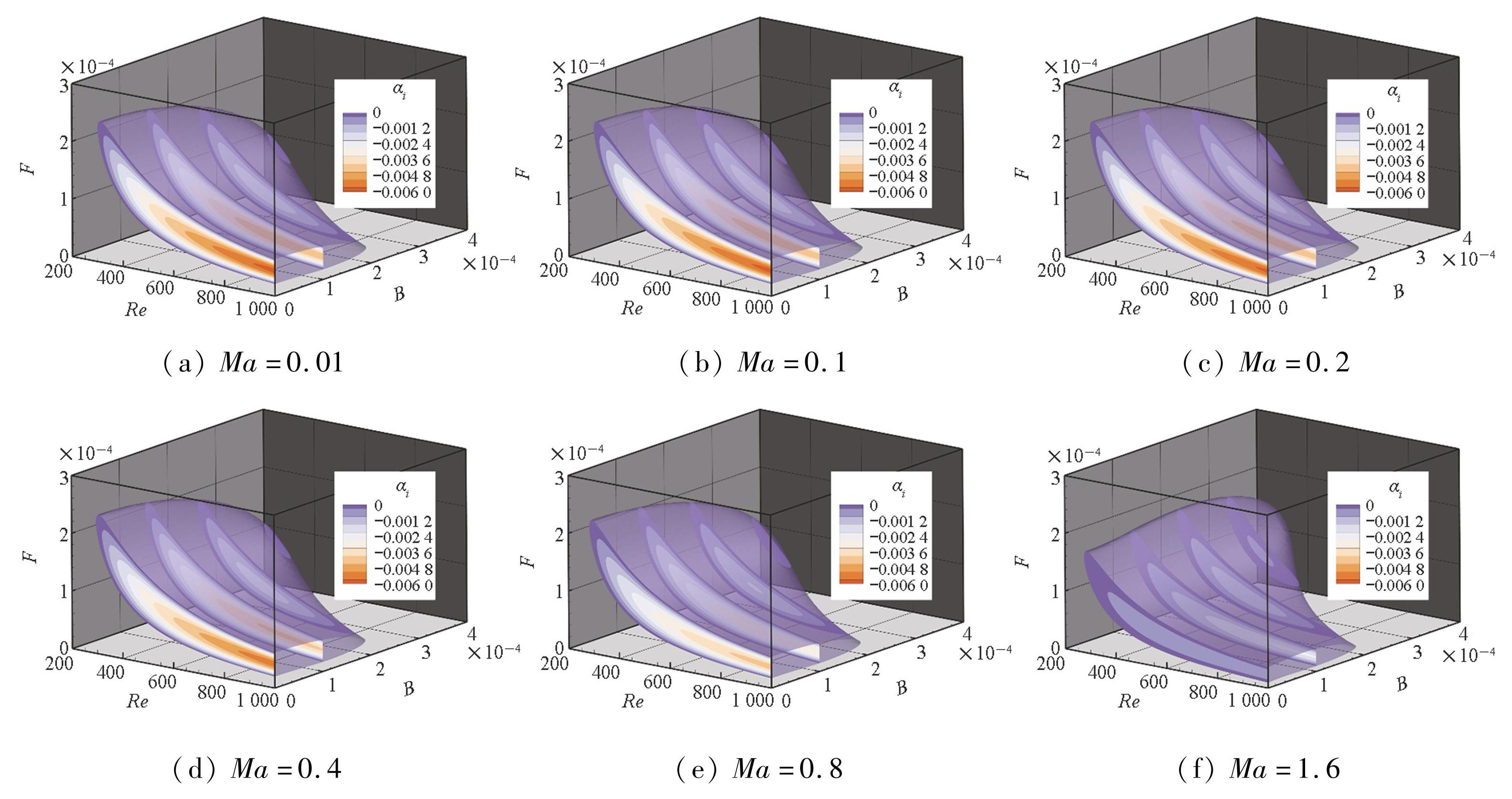 为保证所有工况下的起始流域均位于失稳区内,现基于LST对不同马赫数条件下的流动稳定性进行分析。通过求解局部特征值问题获得扰动增长率αi,构建以雷诺数Re、频率F、波数B为参数的中性曲面,如图2所示。计算结果表明,所设置的各工况起始流域均位于该中性曲面的不稳定区内,从而为后续NPSE计算中扰动的发展演化提供了必要的物理前提。