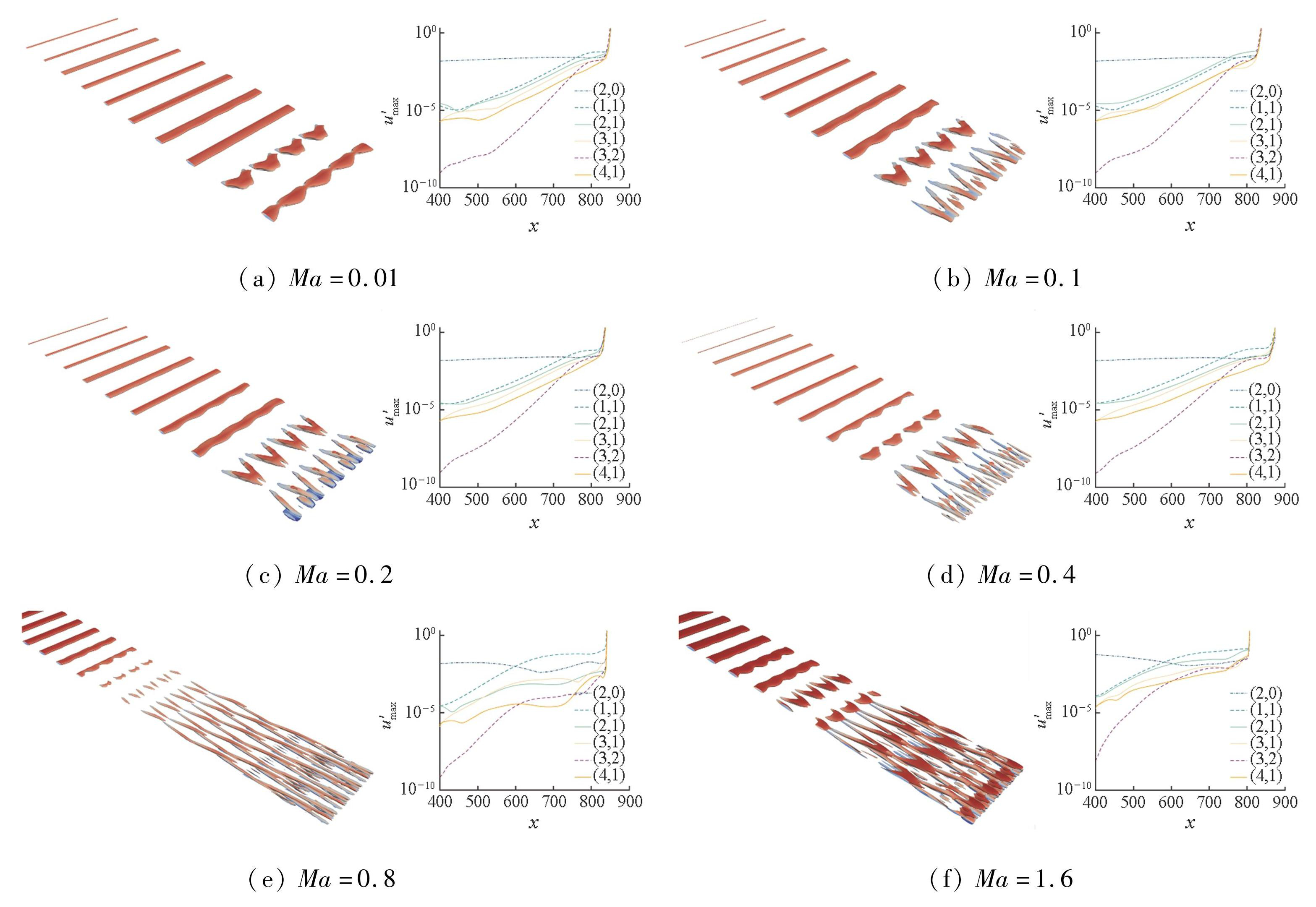 图3相同初始扰动下不同马赫数的转捩演化对比