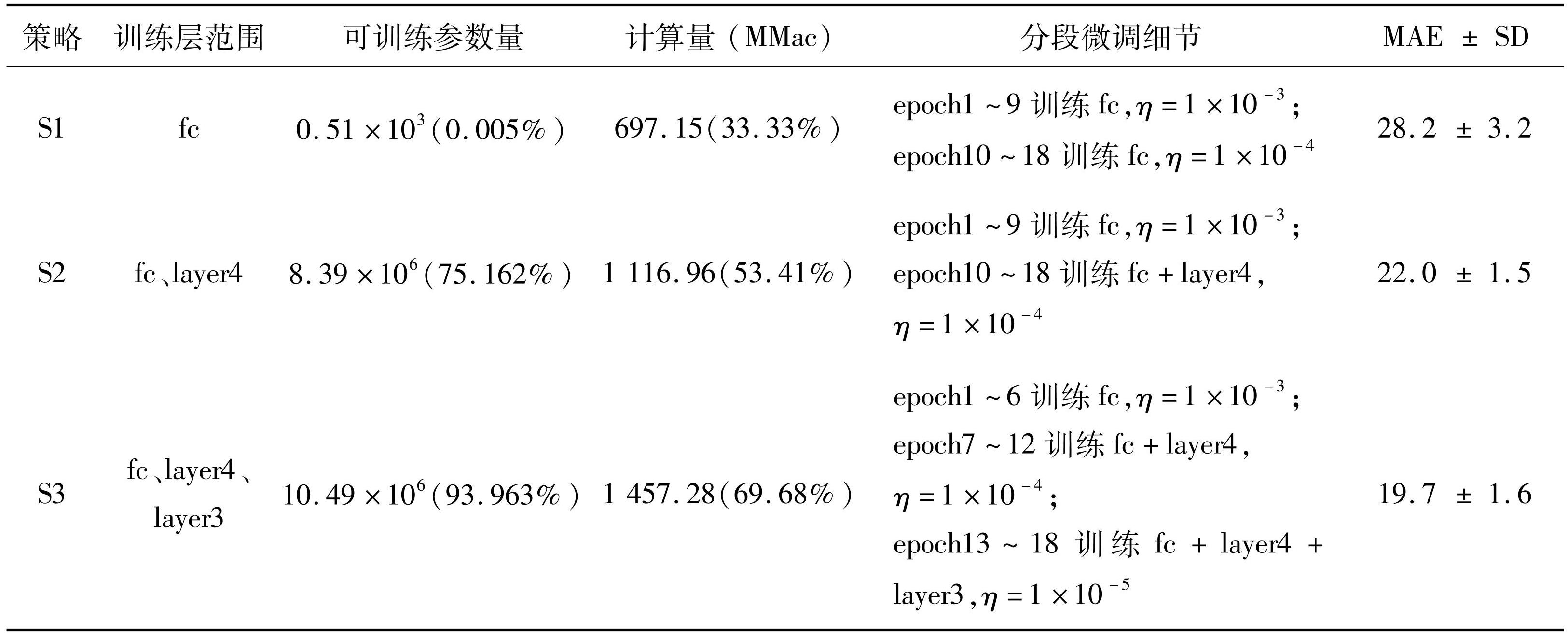 为探讨不同微调策略对迁移效果的影响,以Ma=0.1条件为例开展对比实验。基于ResNet-18的网络结构特点,将其分解为stem、layer1~4和fc等模块,并设计了三种微调策略,如表2所示。在总训练轮次(epoch)一致的前提下,它们的解冻范围依次扩大,相应的可训练参数规模和计算开销也逐步增加,但都在后期降低学习率η以提高收敛稳定性。以百万次乘加运算(million multiply-accumulate operations,MMac)衡量计算量,并考虑到反向传播需分别对权重与输入求梯度,计算量近似为正向传播的2倍。为降低随机性影响,每种策略均进行5次随机训练,最终以预测结果的MAE及其标准差(standard deviation,SD)作为性能评价指标。
