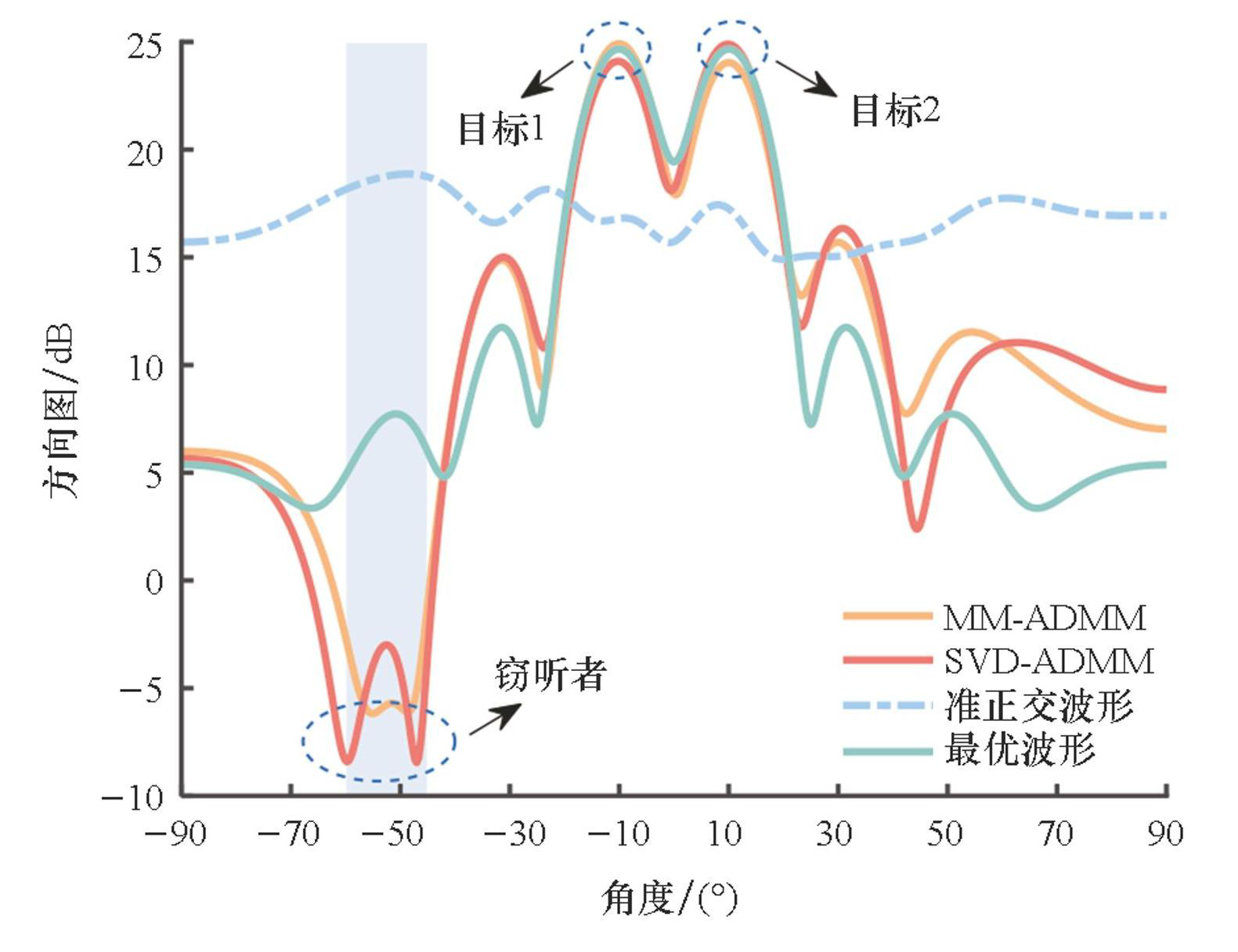 基于式(8),本课题组提出了一种一体化波形设计方法[103]:一是MM-ADMM;二是将奇异值分解(singular value decomposition,SVD)与ADMM结合的方法,记为SVD-ADMM。如图8所示,所设计波形在敌方侦察设备所在的方向上形成凹口,比主瓣响应低30 dB。这种设计使得系统能够在完成高质量通信和高精度探测的同时,有效防止被敌方所侦察,提升系统在复杂电磁环境下的隐蔽通信能力与战场生存能力。