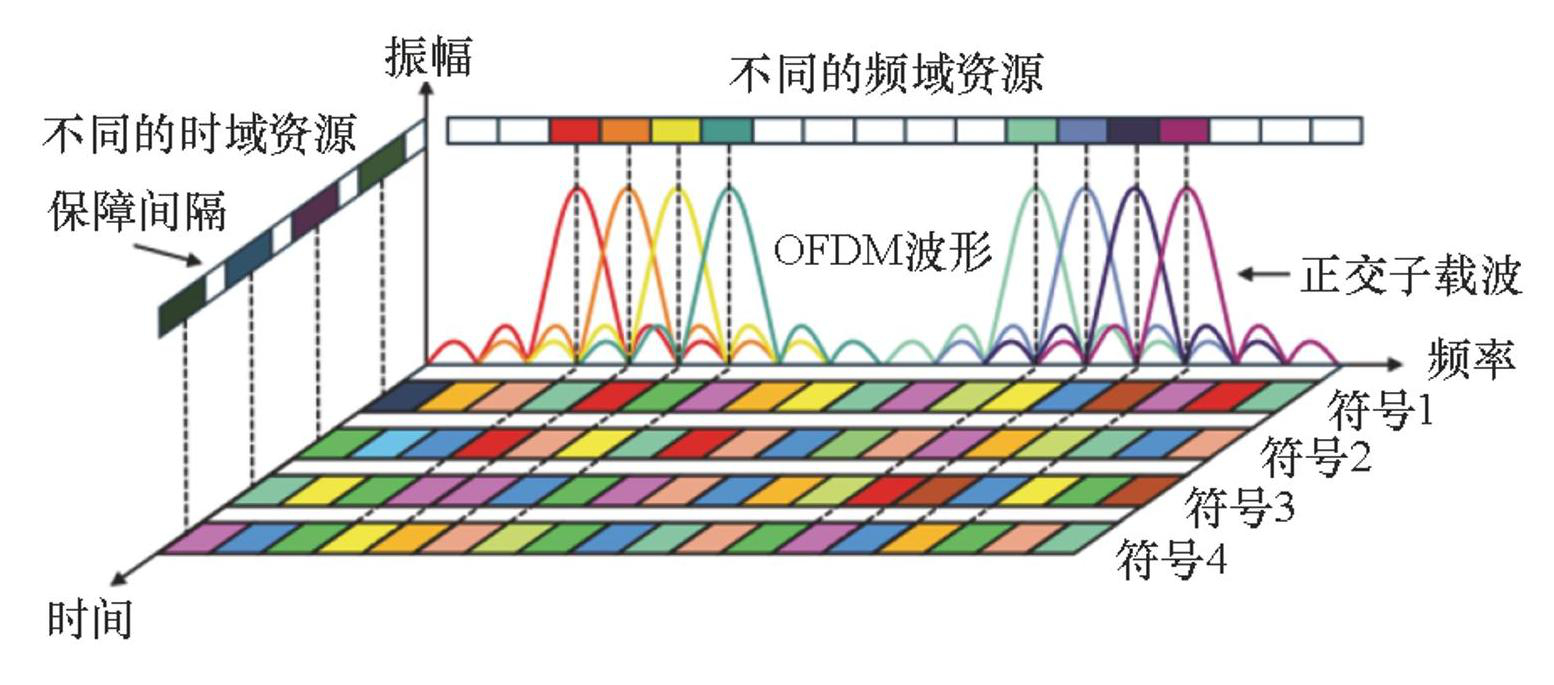 基于正交频分复用(orthogonal frequency-division multiplexing,OFDM)的雷达通信一体化波形方案代表了从通信波形向感知功能延伸的重要方向[49]。如图2所示,OFDM通过将高速数据流分解为多个并行子载波传输,并引入循环前缀(cyclic prefix,CP)以抑制多径干扰和消除符号间干扰(inter-symbol interference,ISI),具有高频谱效率和抗频率选择性衰落等优势,已成为现代军事通信系统的核心波形。然而,当将其直接用于雷达探测时,其感知性能受到信号结构与参数设计的制约,即增加CP长度会牺牲频谱效率,增大子载波间隔则会加剧对多普勒频移的敏感性[50]。荷兰代尔夫特理工大学Nikookar教授等首次评估了组网OFDM雷达的性能,分析了天线方向图及不同接收配置对系统性能的影响[51]。