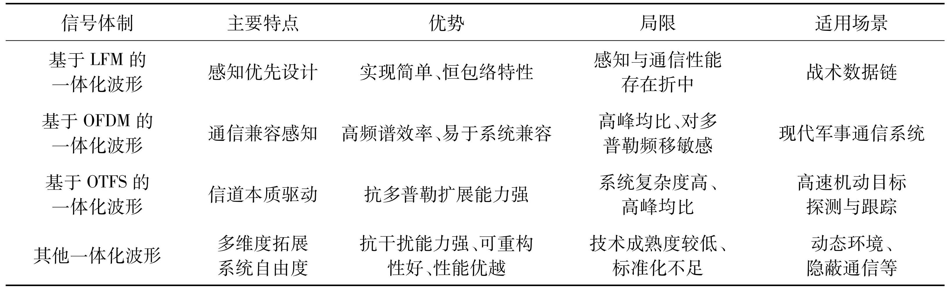 综上,常规雷达通信一体化信号体制发展是从基于LFM嵌入的“感知优先设计”范式到以OFDM为代表的“通信兼容感知”范式,再到以OTFS为代表的“信道本质驱动”范式。未来,雷达通信一体化信号设计将超越单一模式的局部优化,向自适应重构、智能波形与混合架构深度融合的方向发展。通过空、时、频、码等多维资源的动态协同与一体化调度,为构建抗干扰、高可靠、全维联合作战体系提供关键技术支撑。最后,本节对所提及的常规一体化系统信号体制特点进行总结,如表1所示。