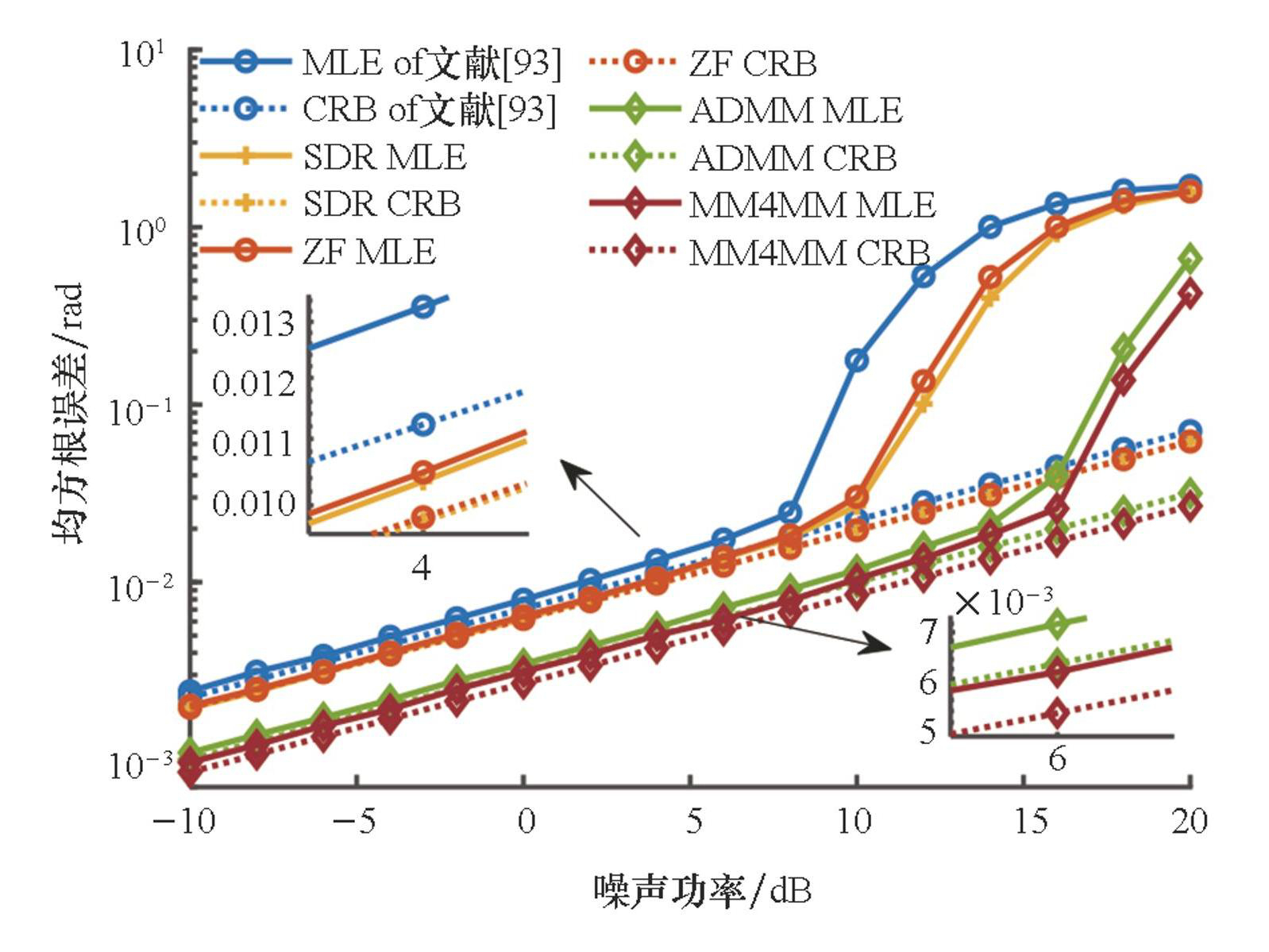 发射方向图如图3所示,均方根误差随噪声功率变化曲线如图4所示。图3和图4中的仿真实验结果表明,基于该上界所设计的波束成形矩阵能够同时实现高性能的多目标参数估计与高质量的多用户通信。虽然上述方法设计的一体化波形能够显著提升目标参数估计性能,但该方法需要提前获取较为精确的目标位置和幅度信息,若先验信息存在较大的误差,可能会使感知性能下降。