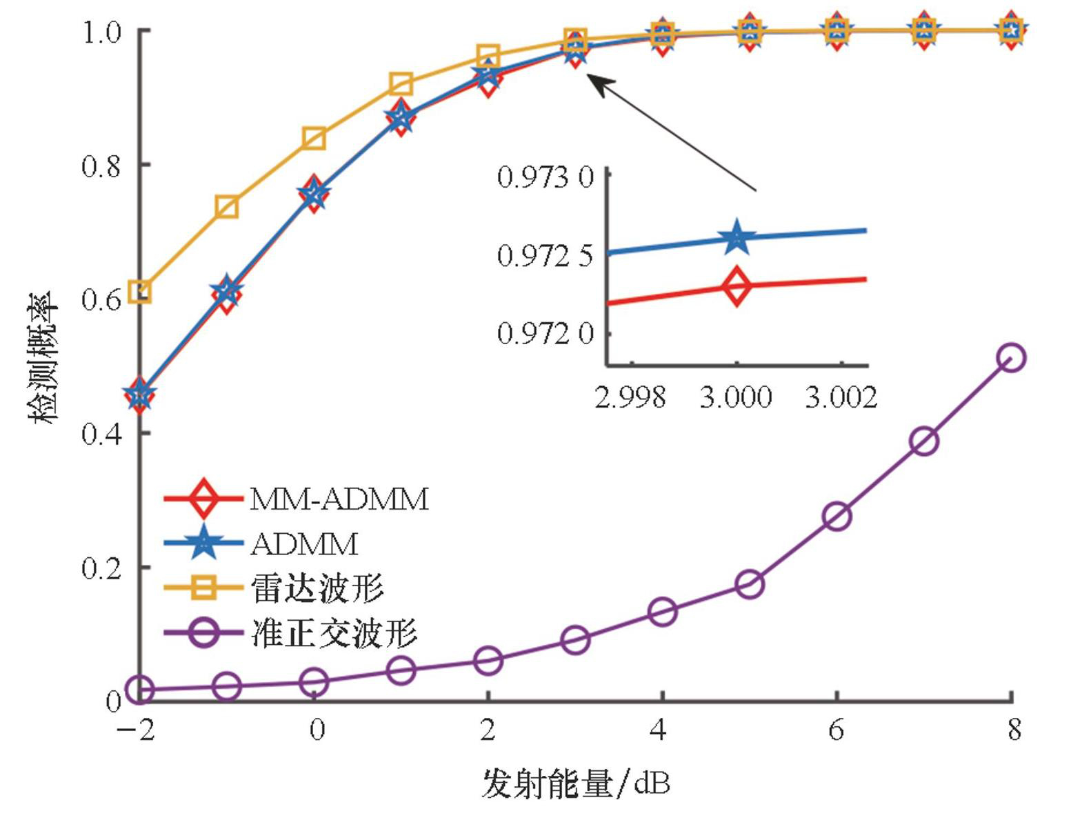 除了互信息,信息论中的相对熵准则也可用于雷达通信一体化波形设计中,用于提高目标检测性能。为提高莱斯目标的检测性能,本课题组以相对熵作为波形设计准则,同时对波形施加通信多用户干扰(multi-user interference,MUI)能量约束,以保证多用户通信的服务质量。采用两种方法求解所构建的一体化波形设计问题:一是ADMM;二是将下界函数最大化(minorization-maximization,MM)与ADMM结合的方法,记为MM-ADMM。如图5所示,所设计的一体化波形具有较好的莱斯目标检测与多用户通信性能[96]。