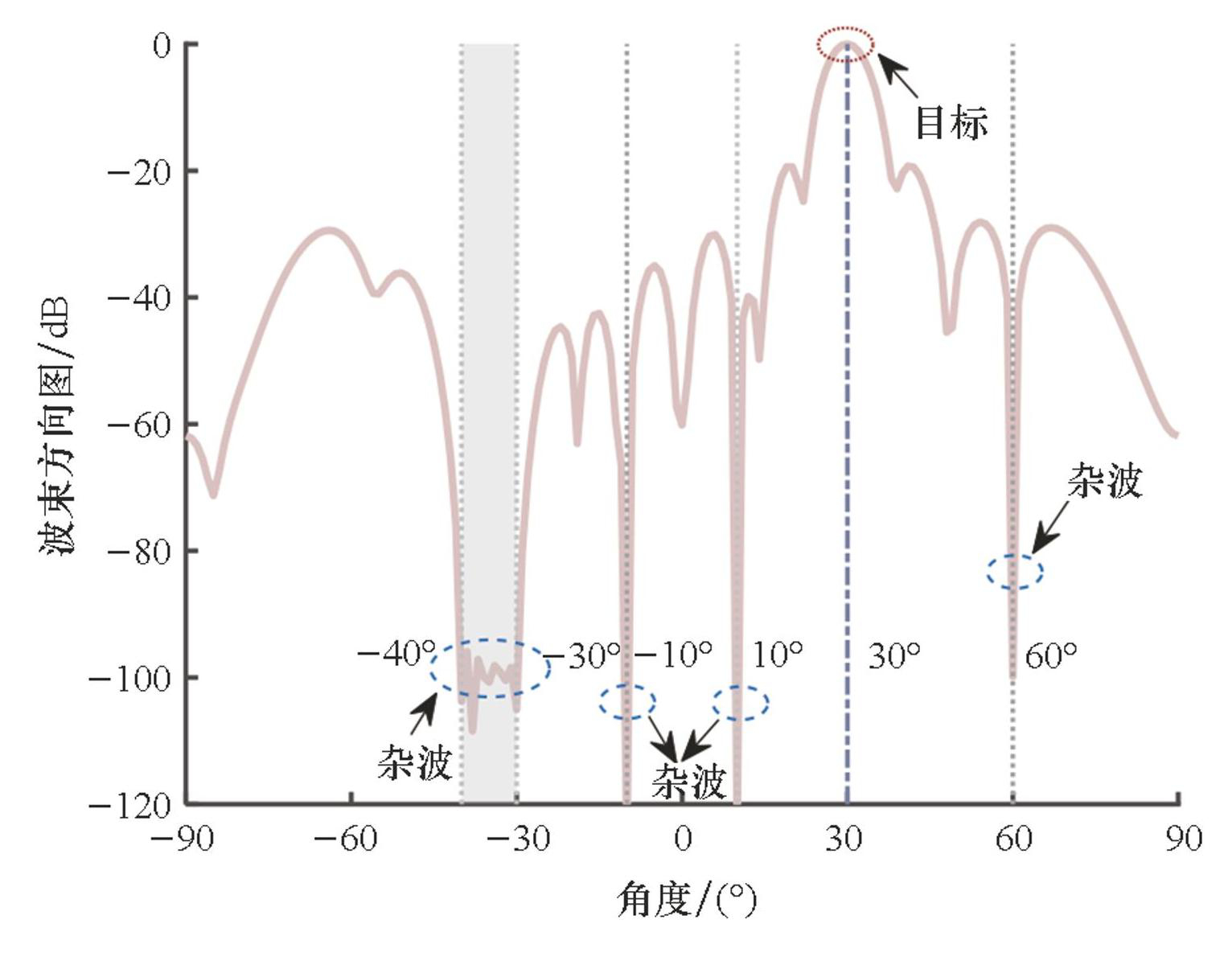 为避开权重系数选择的难题,本课题组提出以每一用户的干扰能量为约束条件,以最大化信干噪比为准则,分别在波形相似性约束[101]与恒模约束[102]下,对发射波形与接收滤波器进行联合优化。如图6所示,在相似性约束下,所形成的波束方向图在目标方向上响应最强,在点杂波位置均产生低于-120 dB的零陷,在块杂波方向上形成响应低于-90 dB的凹槽,表明该算法能有效抑制杂波,提升系统在复杂环境中的探测能力。